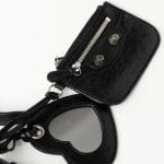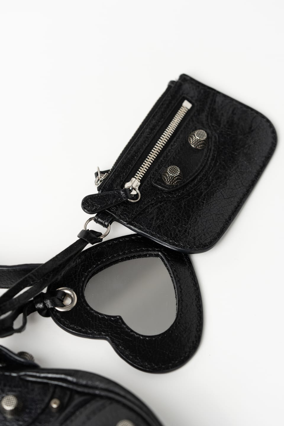 Oglindă detașabilă în formă de inimă și pouch pentru carduri/chei, ambele atașate prin curele subțiri din piele.