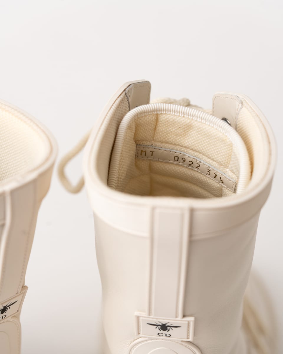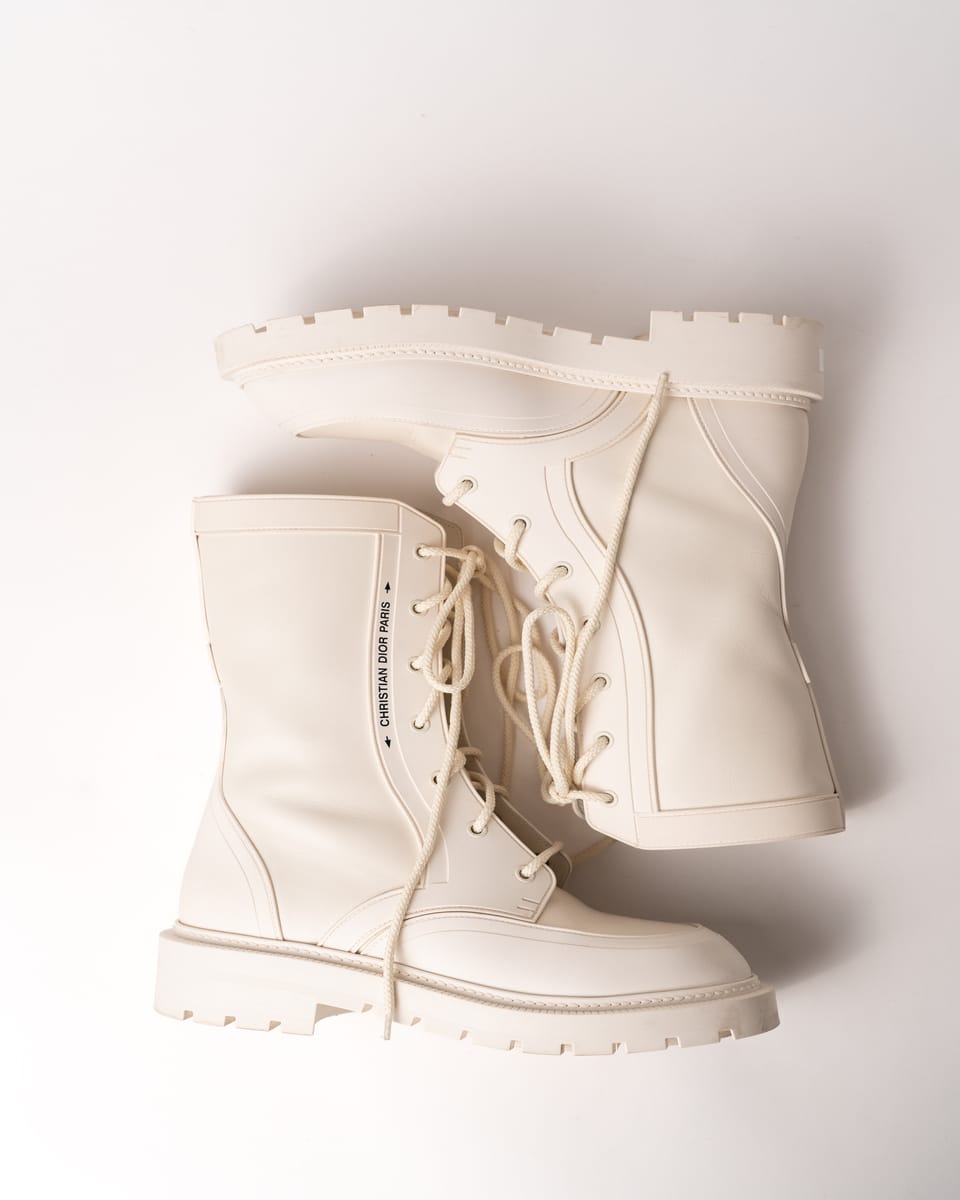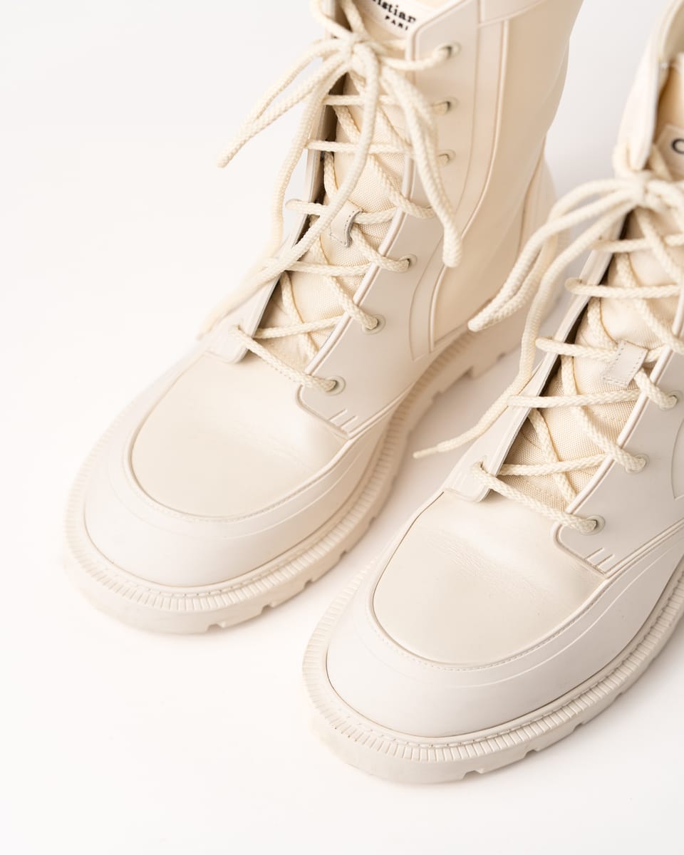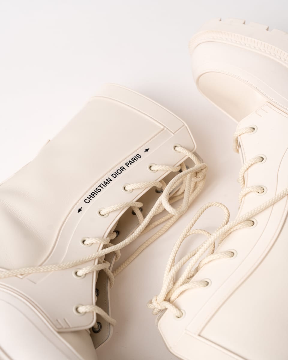 Iconicii bocanci Urban-D de la DIOR îmbină perfect estetica modernă cu funcționalitatea urbană. Realizați într-o nuanță elegantă de off-white/cream, se remarcă prin silueta chunky contemporană și combinația sofisticată de piele netedă și material textil.