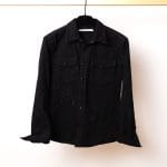 Această cămașă poate fi purtată ca piesă centrală într-un look „all-black”, alături de pantalonii de piele Manokhi pentru un contrast de texturi, sau descheiată peste un tricou alb minimalist pentru o ținută de zi relaxată.