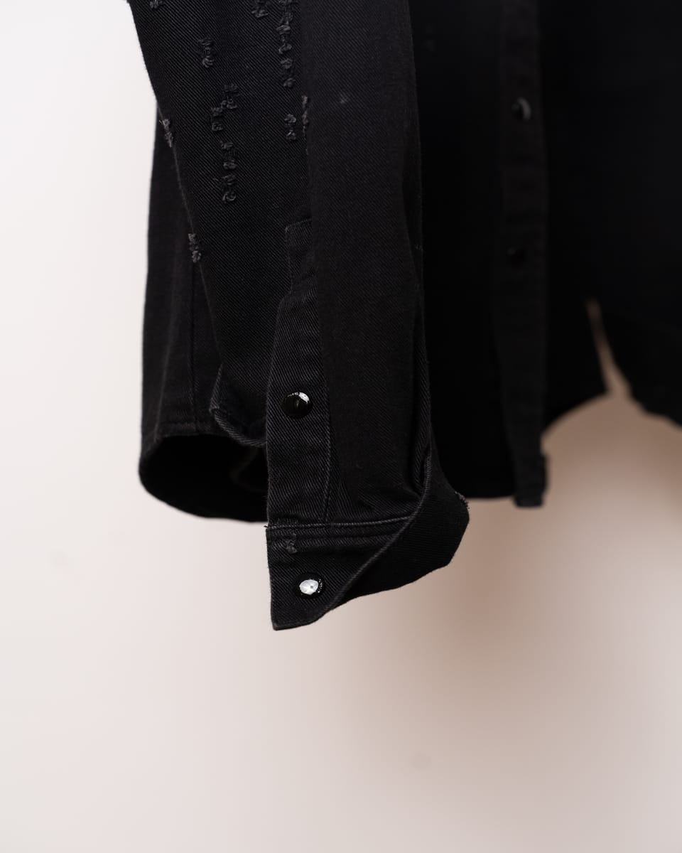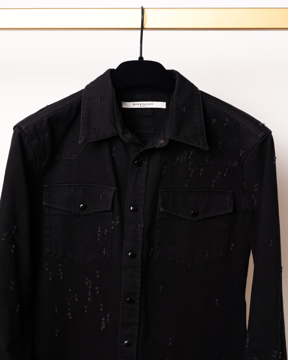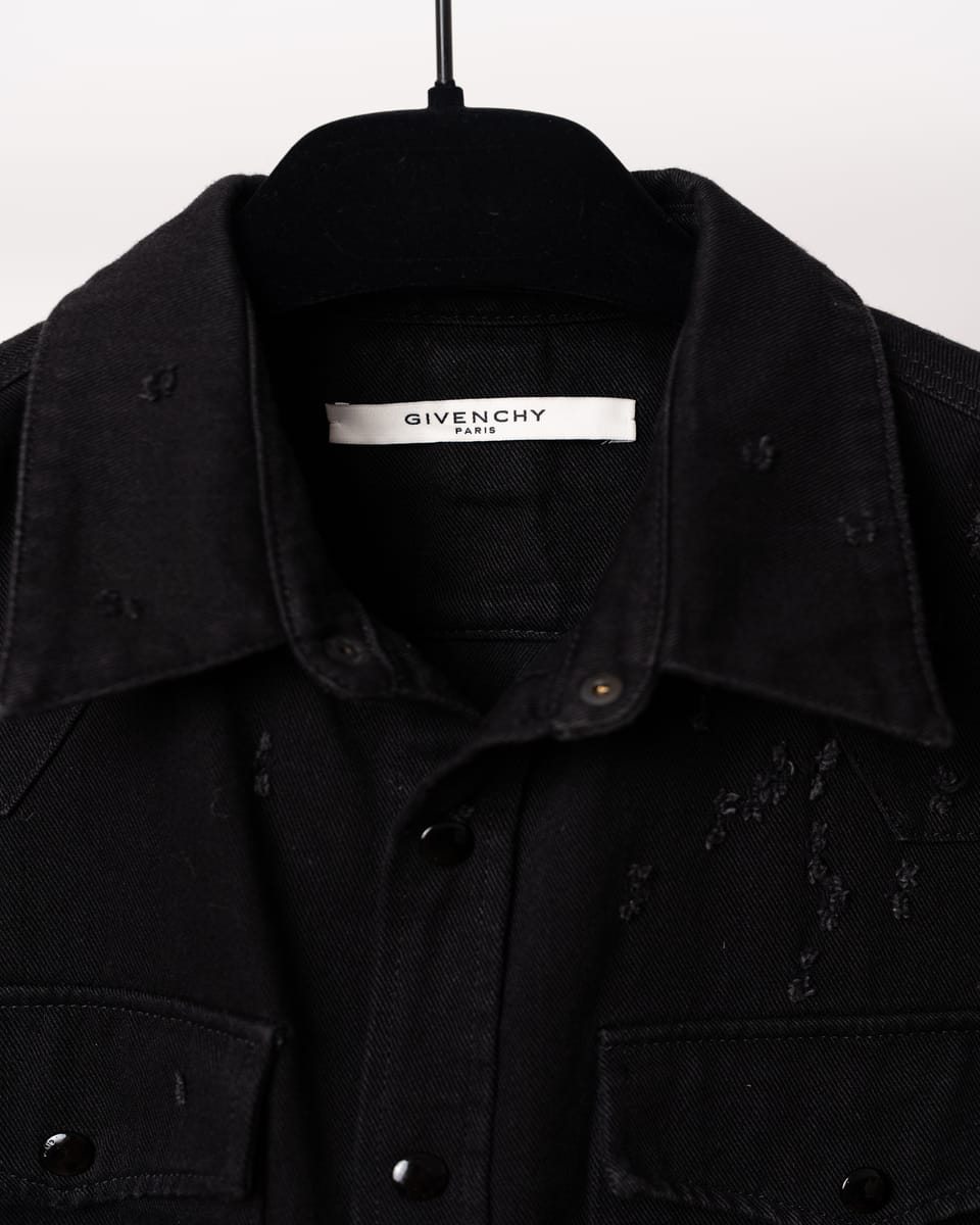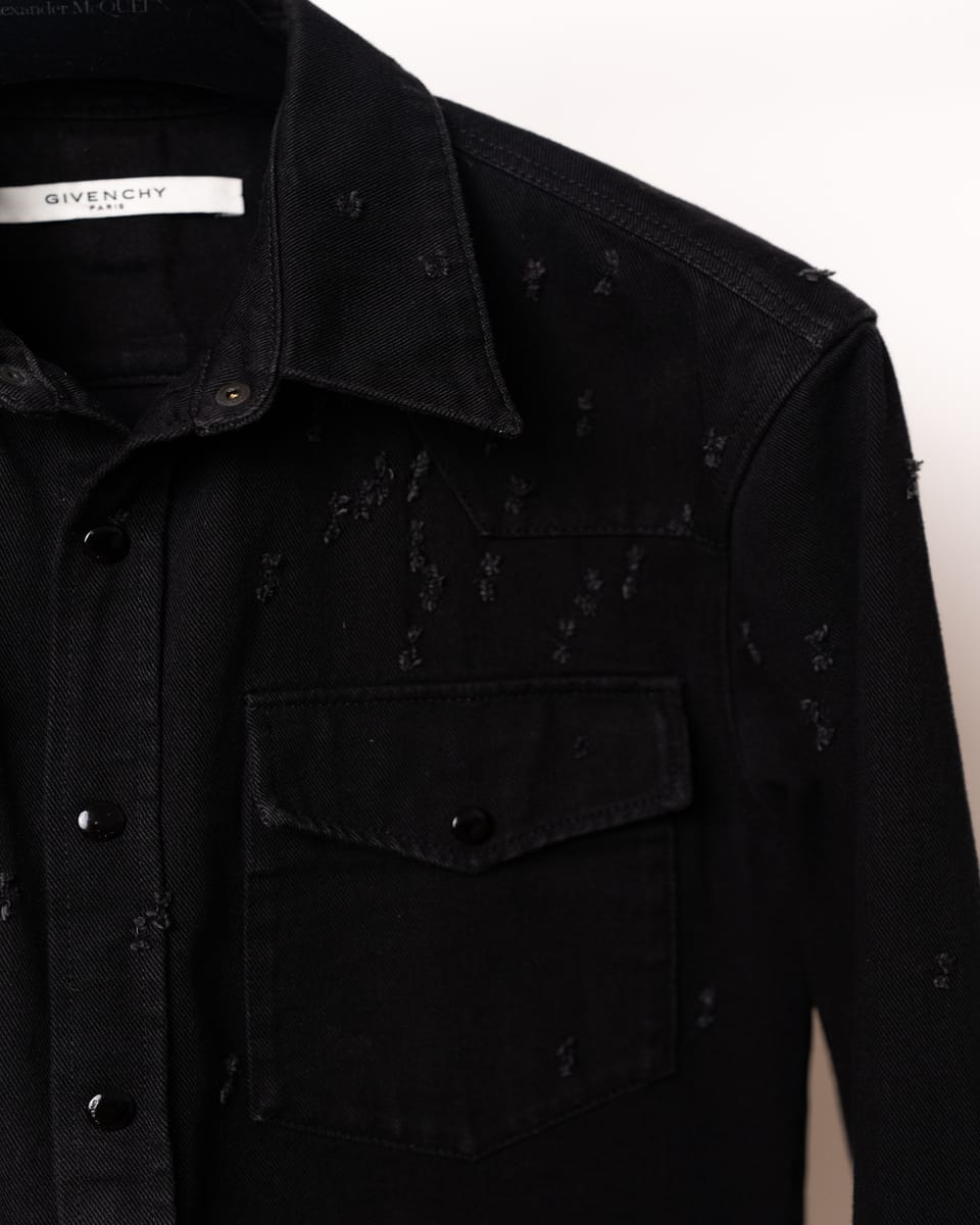Această cămașă din denim negru semnată Givenchy este o piesă esențială ce îmbină estetica western cu detaliile deconstruite specifice luxului contemporan. Designul se remarcă prin finisajele „distressed” realizate cu precizie, oferind o textură vizuală complexă unei siluete clasice.
