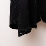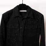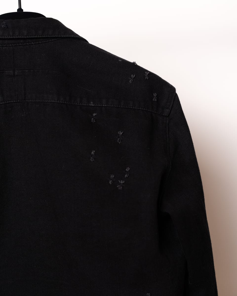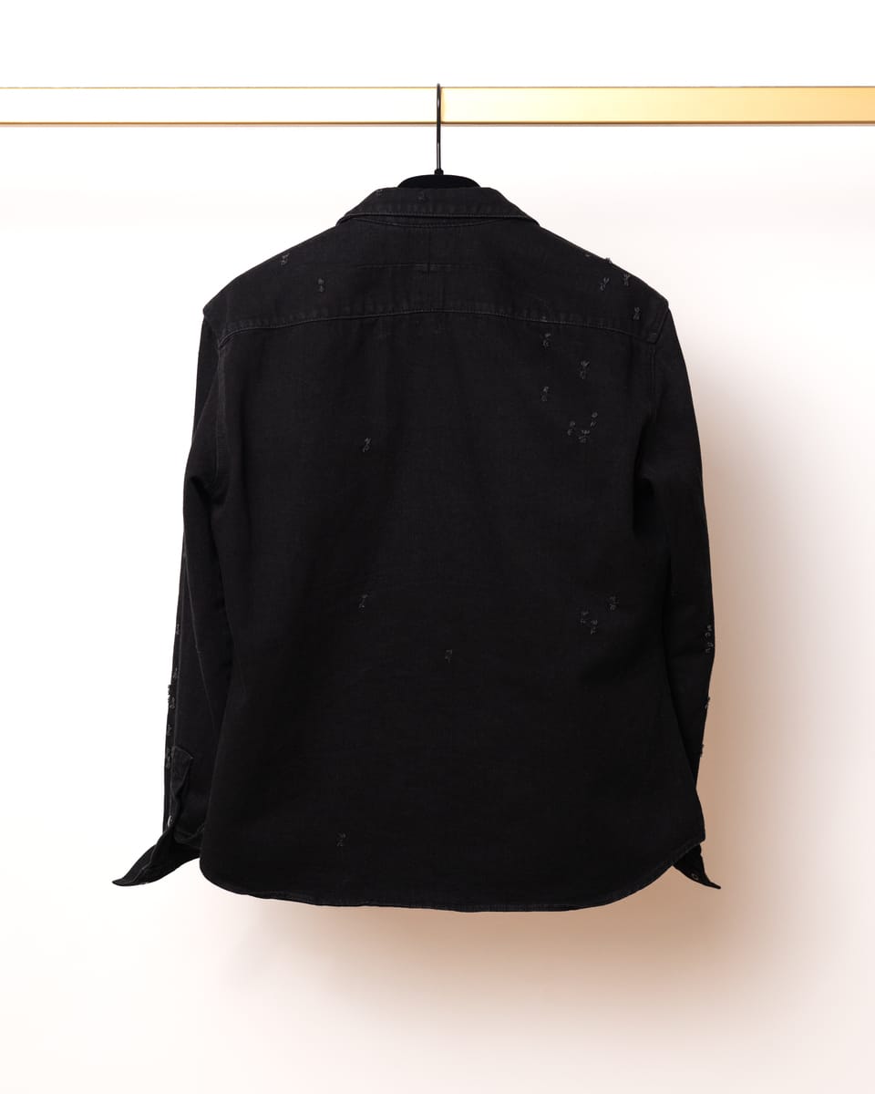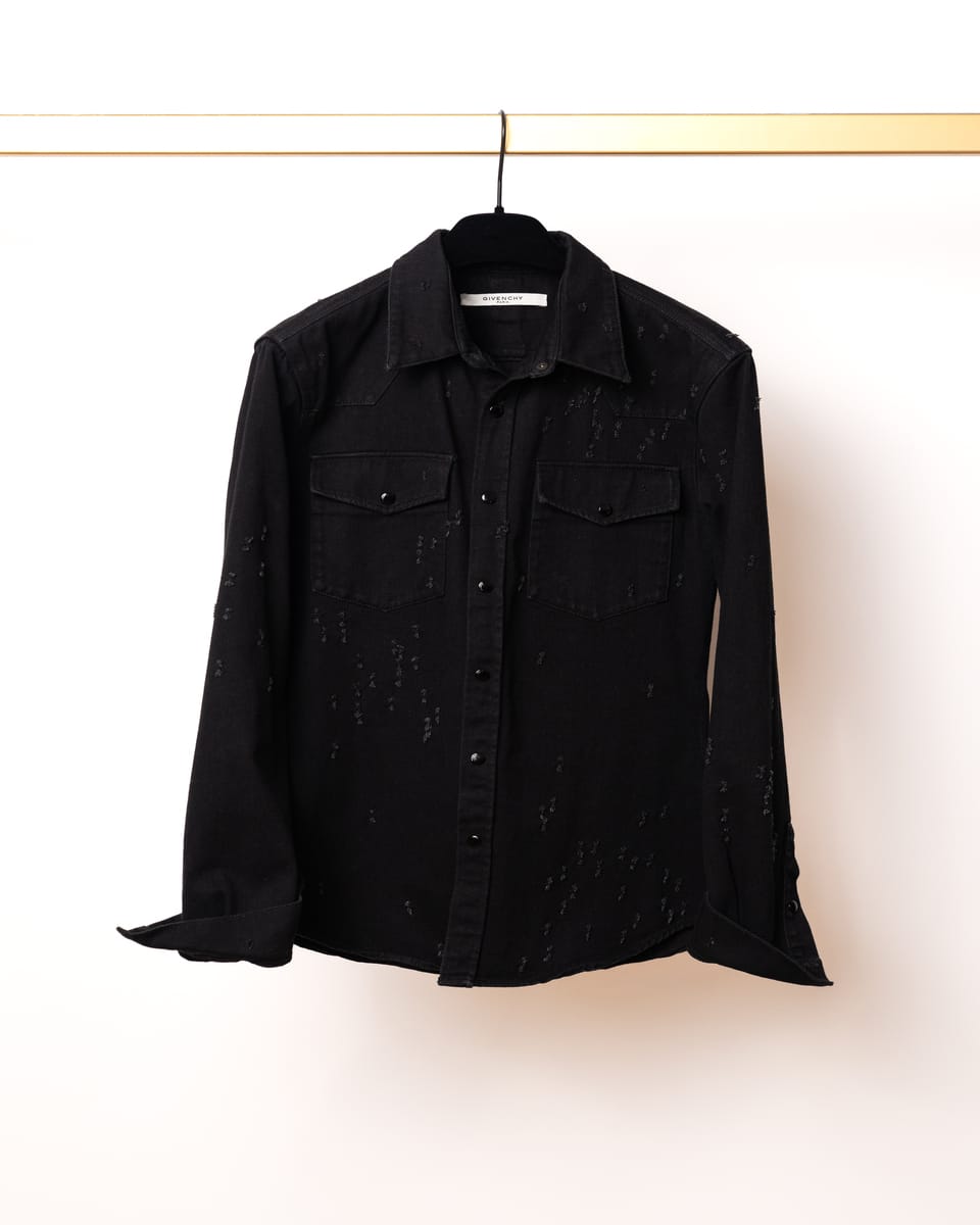 Această cămașă din denim negru semnată Givenchy este o piesă esențială ce îmbină estetica western cu detaliile deconstruite specifice luxului contemporan. Designul se remarcă prin finisajele „distressed” realizate cu precizie, oferind o textură vizuală complexă unei siluete clasice.