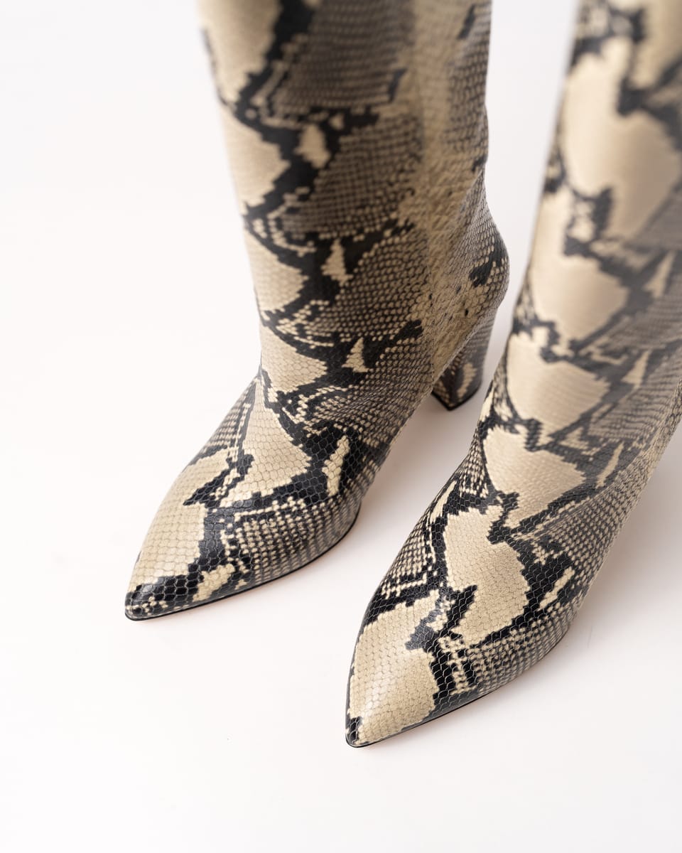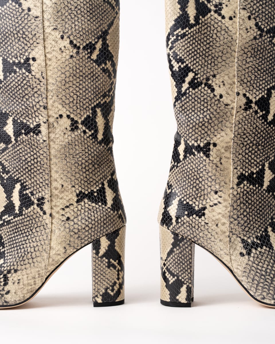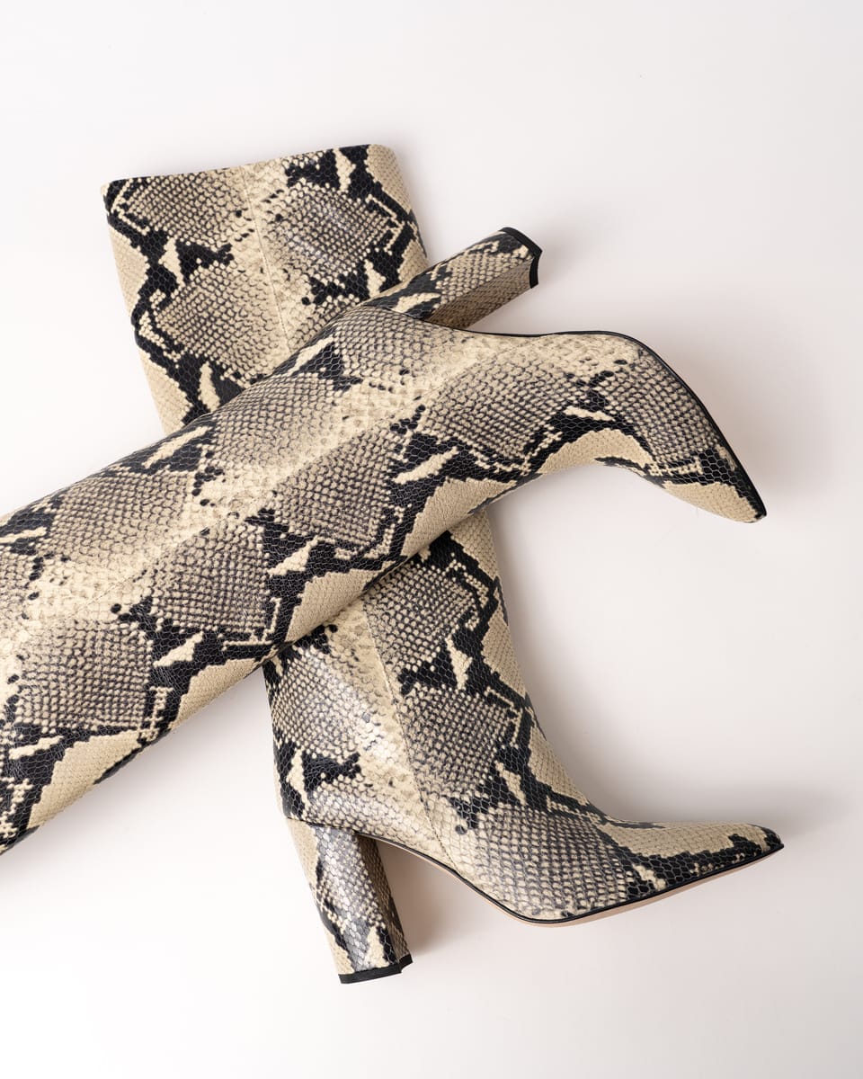 Realizate din piele de calitate superioară cu print de piton și având un toc mediu, oferă confort și un look versatil pentru ținute casual-chic sau îndrăznețe.