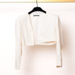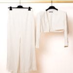 Acest ansamblu „monochrome” necesită accesorii minimale pentru a păstra impactul vizual al croielii. Poate fi purtat cu o bustieră din mătase pe dedesubt sau chiar direct pe piele (pentru un look editorial), accesorizat cu bijuterii aurii masive și sandale cu toc înalt.