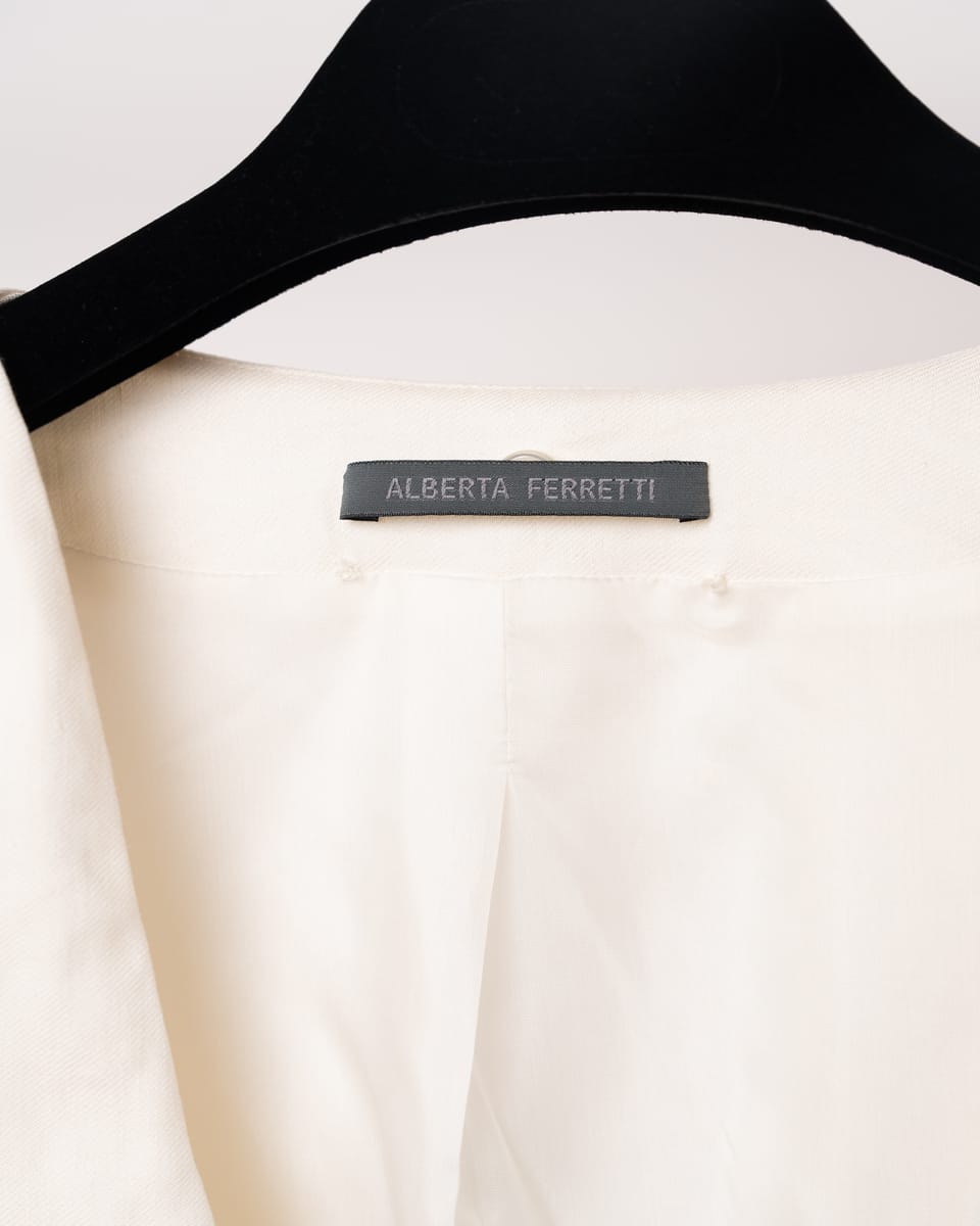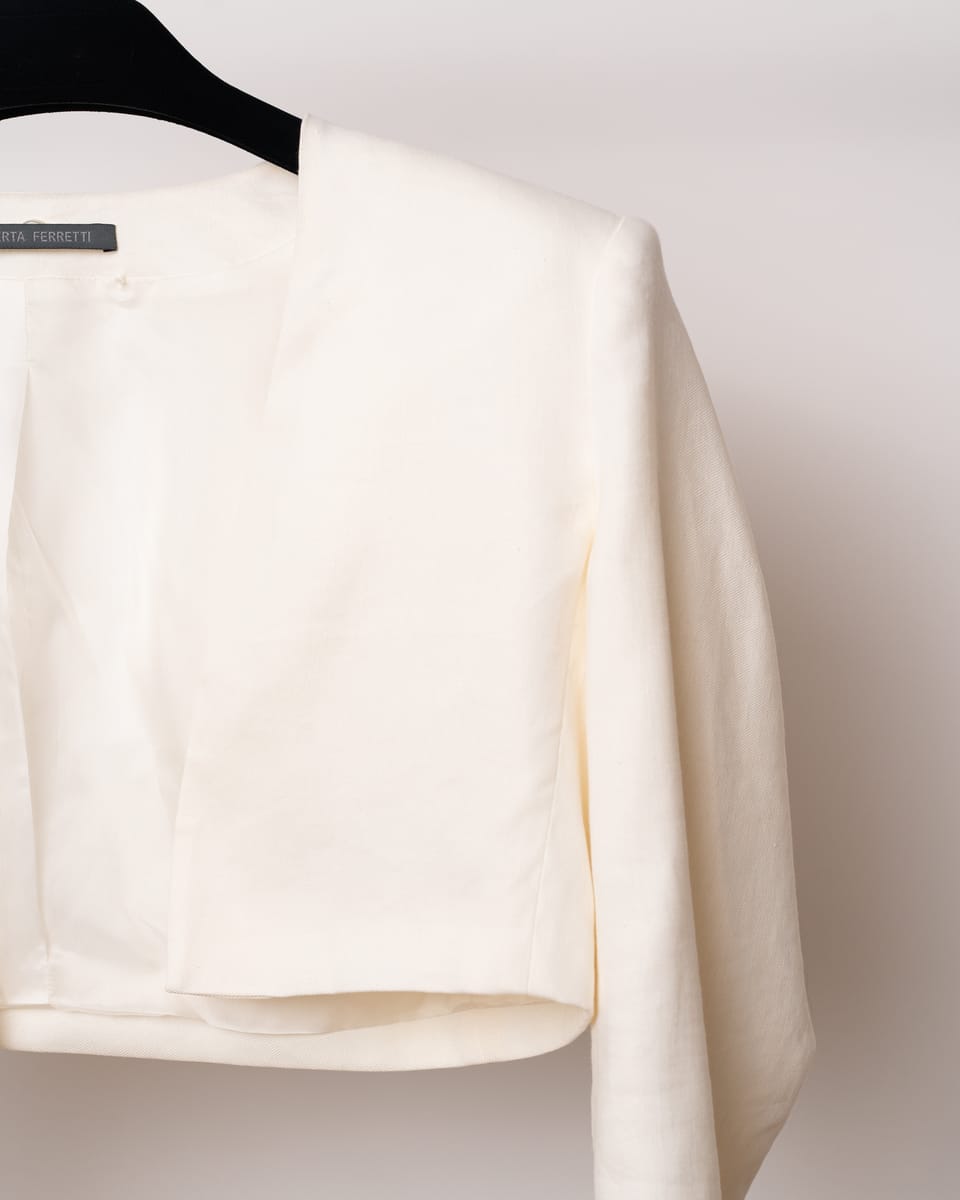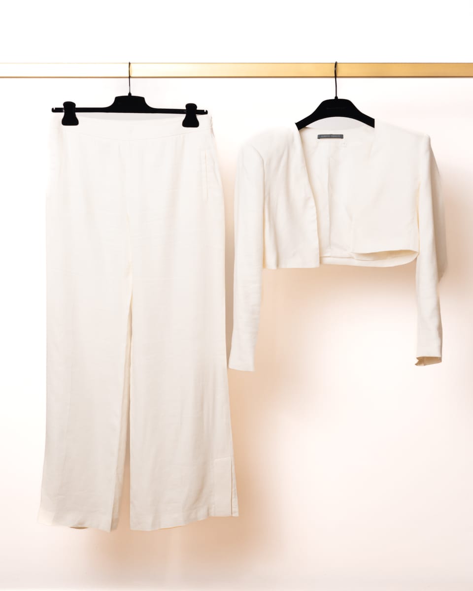 Acest set reprezintă esența rafinamentului italian, combinând minimalismul cromatic cu o croială sculpturală. Realizat dintr-o țesătură premium (amestec de in cu vâscoză), ansamblul este ideal pentru evenimente formale de zi, cocktail-uri sau chiar ca ținută alternativă pentru o mireasă modernă.