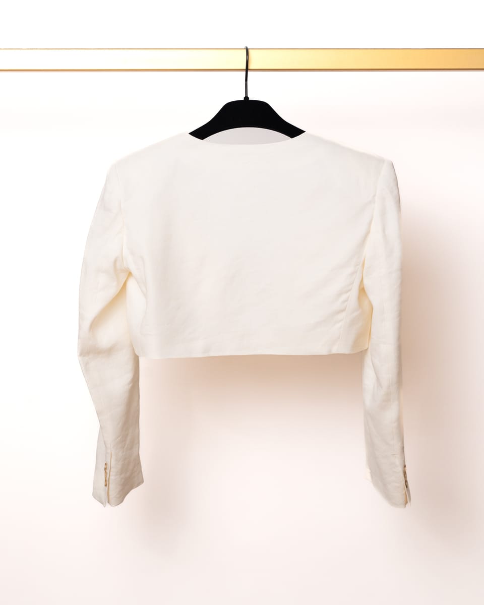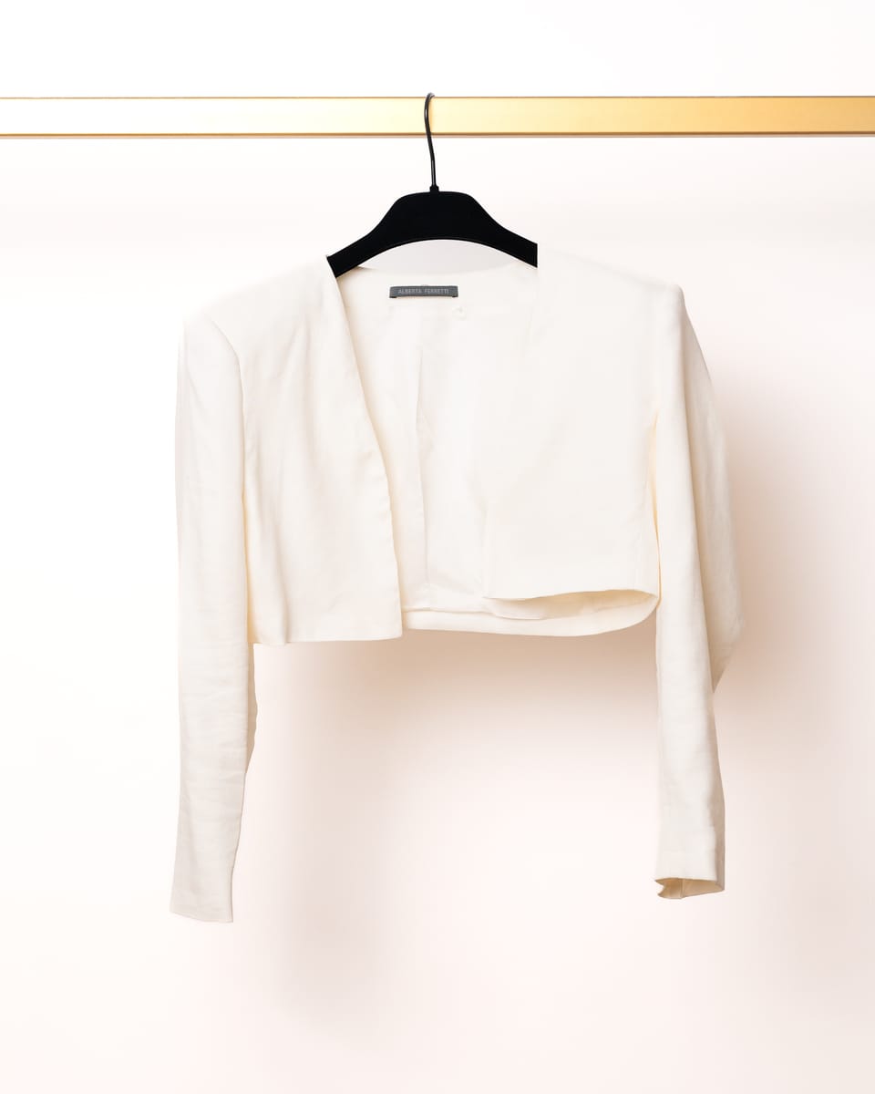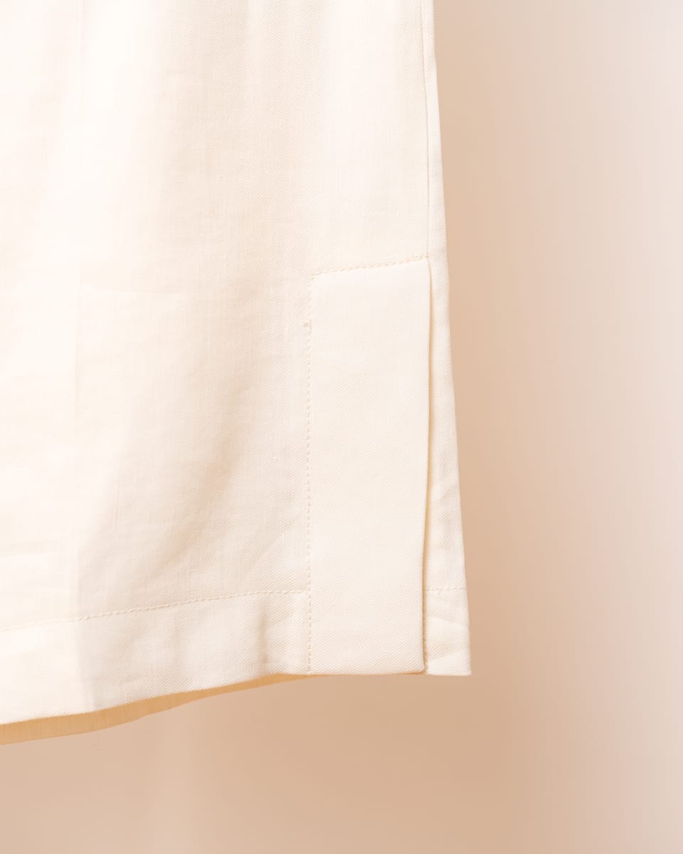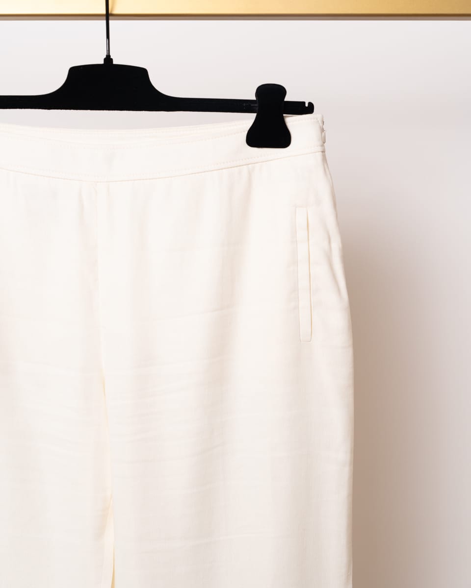 Acest set reprezintă esența rafinamentului italian, combinând minimalismul cromatic cu o croială sculpturală. Realizat dintr-o țesătură premium (amestec de in cu vâscoză), ansamblul este ideal pentru evenimente formale de zi, cocktail-uri sau chiar ca ținută alternativă pentru o mireasă modernă.