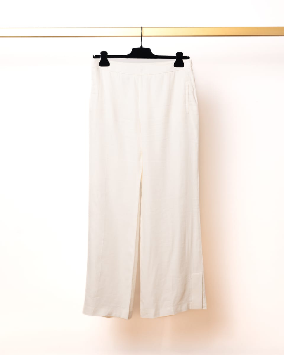 Croială: Pantaloni cu talie înaltă și picior foarte larg (palazzo), care creează un efect de alungire și fluiditate în mișcare.