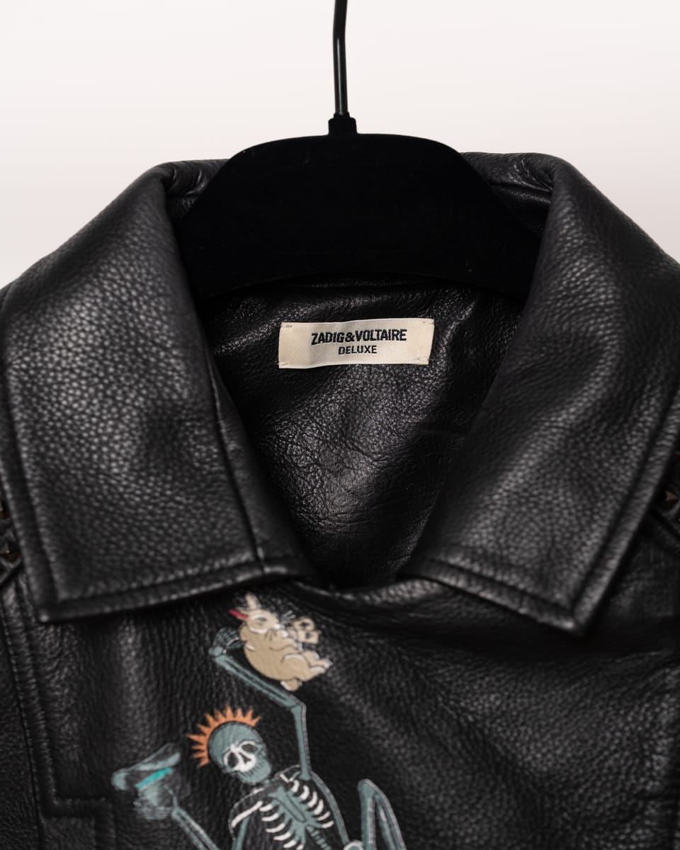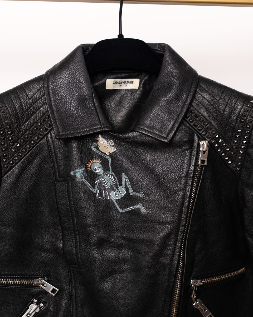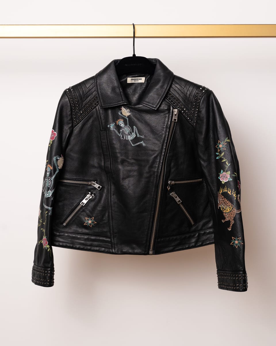 Geacă de piele, semnată Zadig & Voltaire, cu fermoar și inserții metalice, ce îi conferă un aer rock și sofisticat.