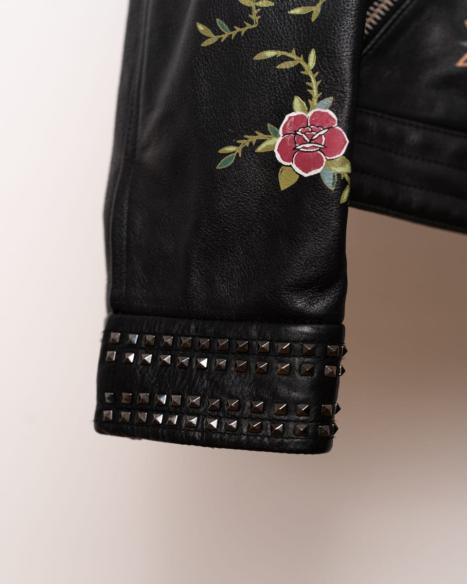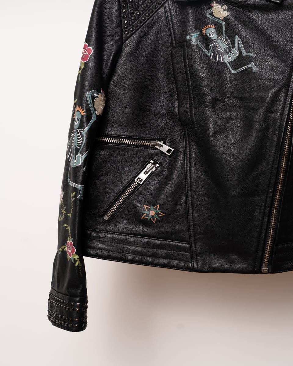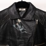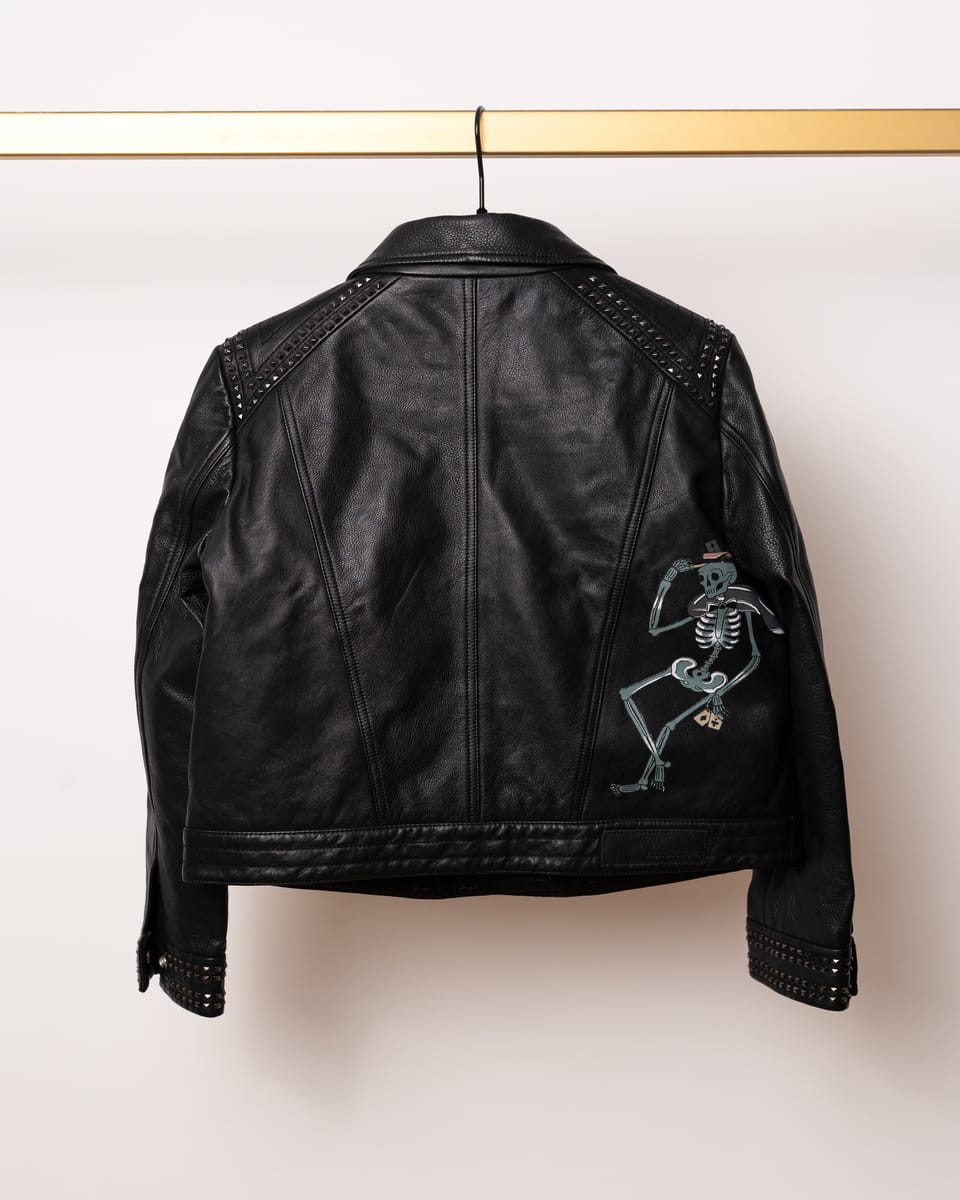 Geacă de piele, semnată Zadig & Voltaire, cu fermoar și inserții metalice, ce îi conferă un aer rock și sofisticat.