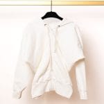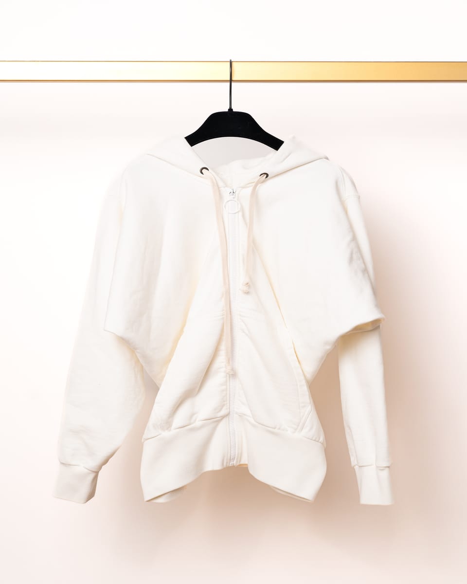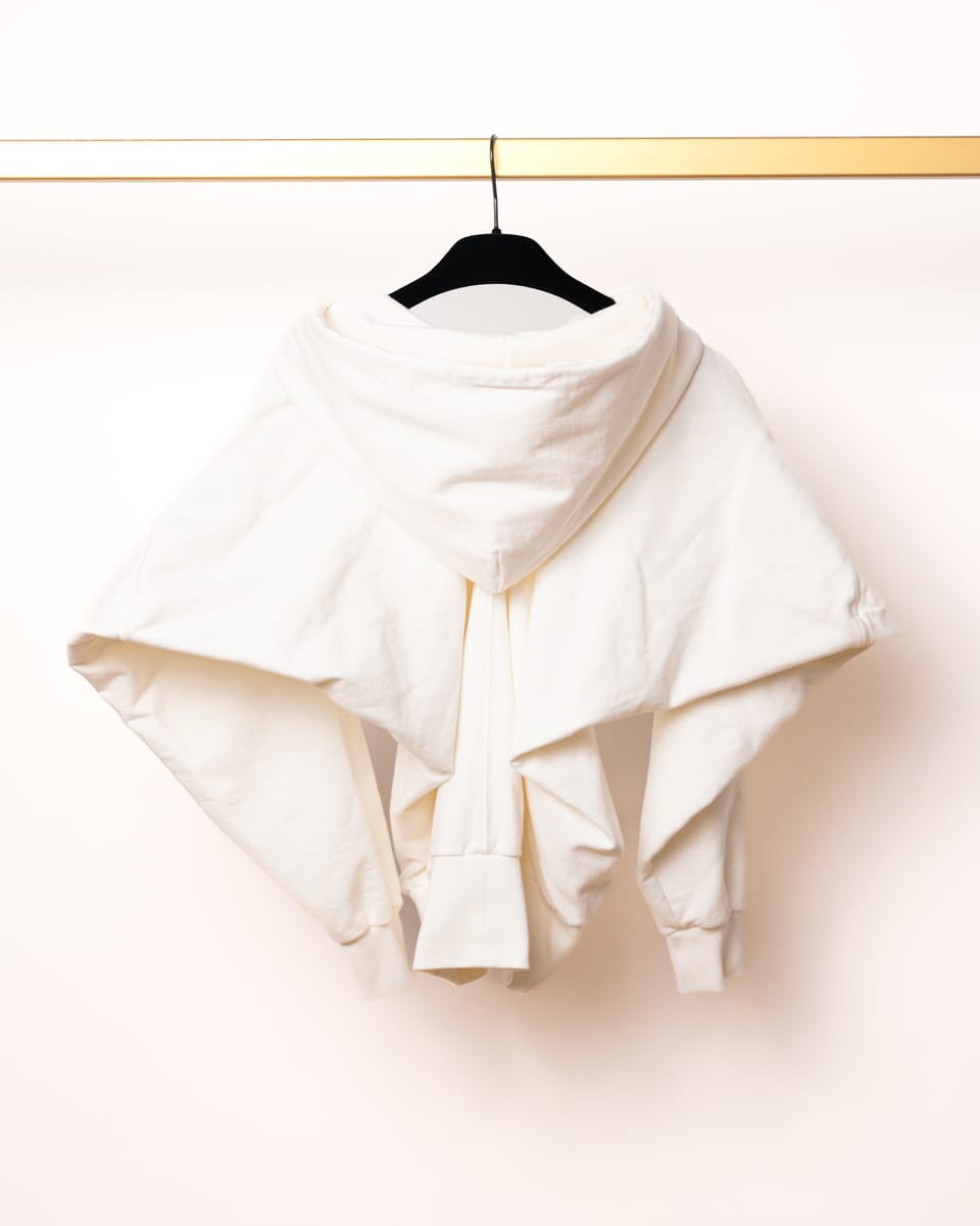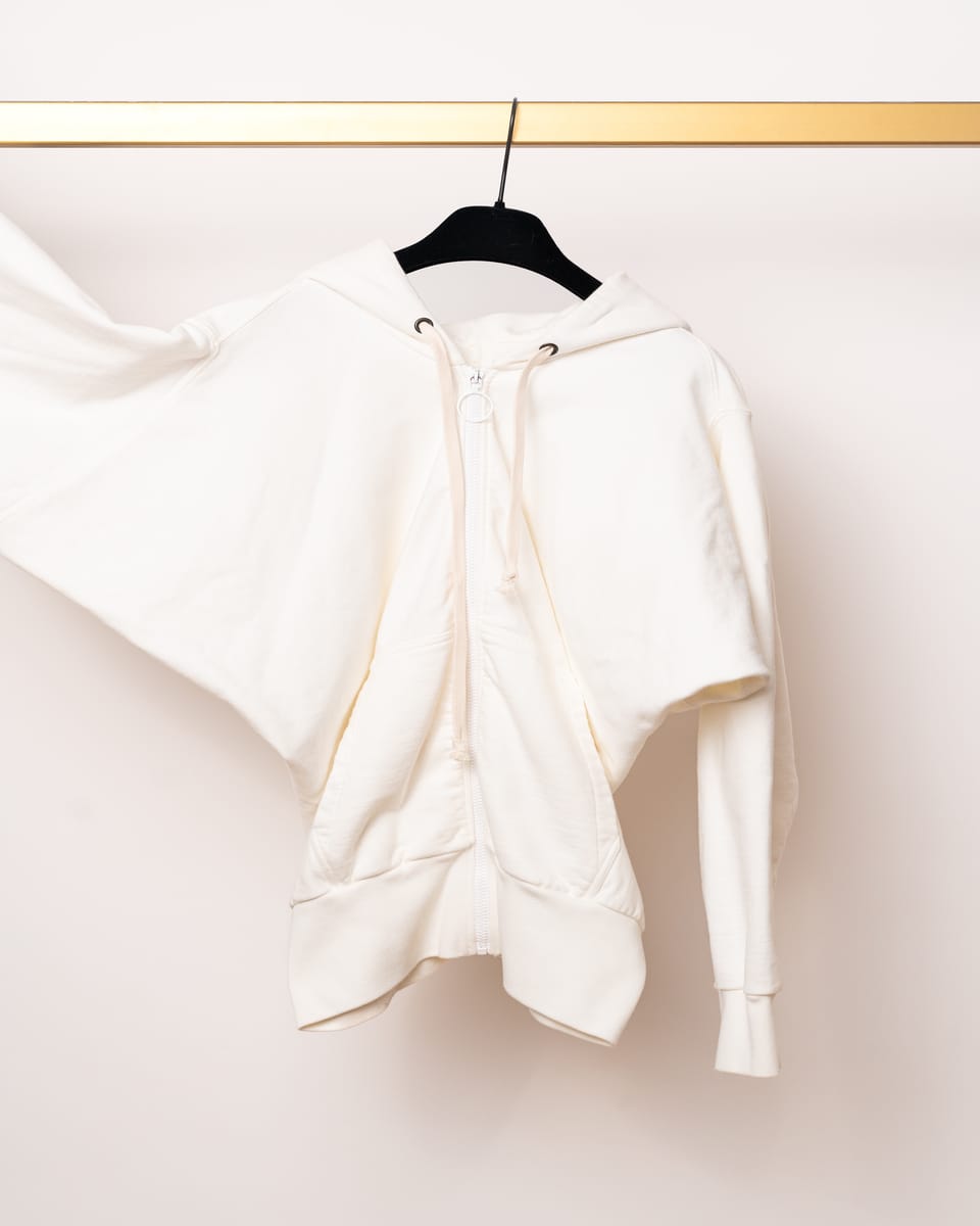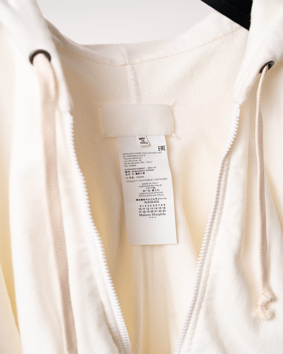 Acest hanorac semnat Maison Margiela este o piesă conceptuală ce redefinește stilul sportiv prin tehnici de deconstrucție și detalii avangardiste. Designul se remarcă prin croiala neconvențională a mânecilor și prin atenția la detaliile structurale specifice casei de modă pariziene.