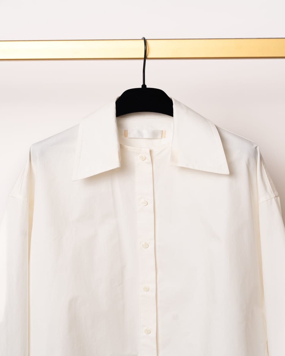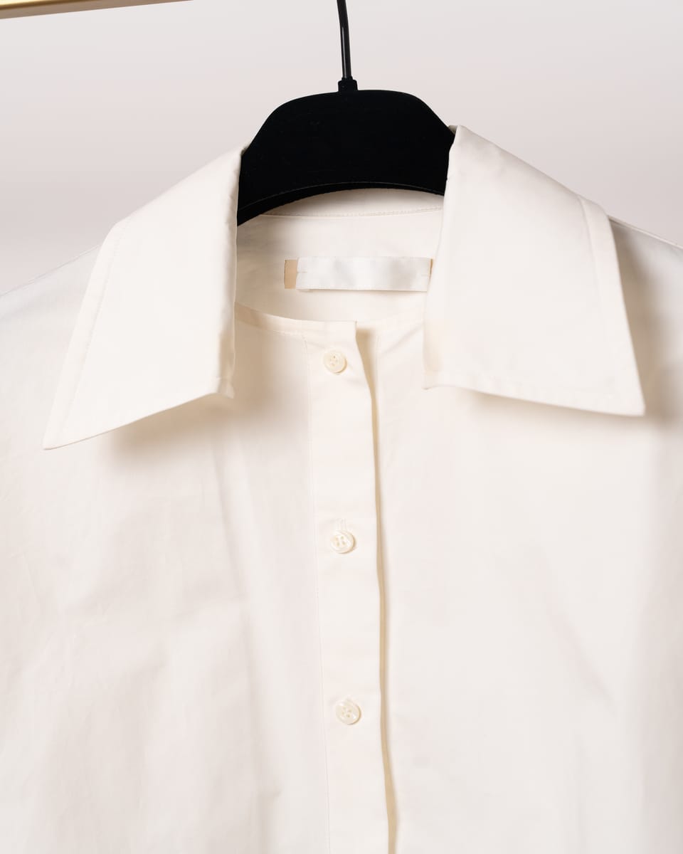 O cămașă albă deconstruită este baza perfectă pentru o ținută minimalistă, dar cu impact. Purtați-o cu pantaloni scurți din piele neagră și mocasini chunky pentru un look modern și urban.