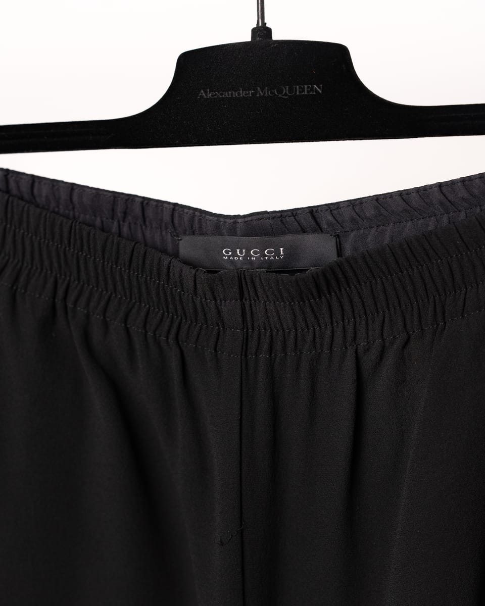 Adaugă o notă de rafinament relaxat garderobei tale cu acești pantaloni semnați Gucci. Confecționați dintr-o mătase grea, de o calitate excepțională, aceștia reinterpretează silueta sport printr-o prismă couture, fiind ideali pentru persoanele care nu fac compromisuri între stil și confort.