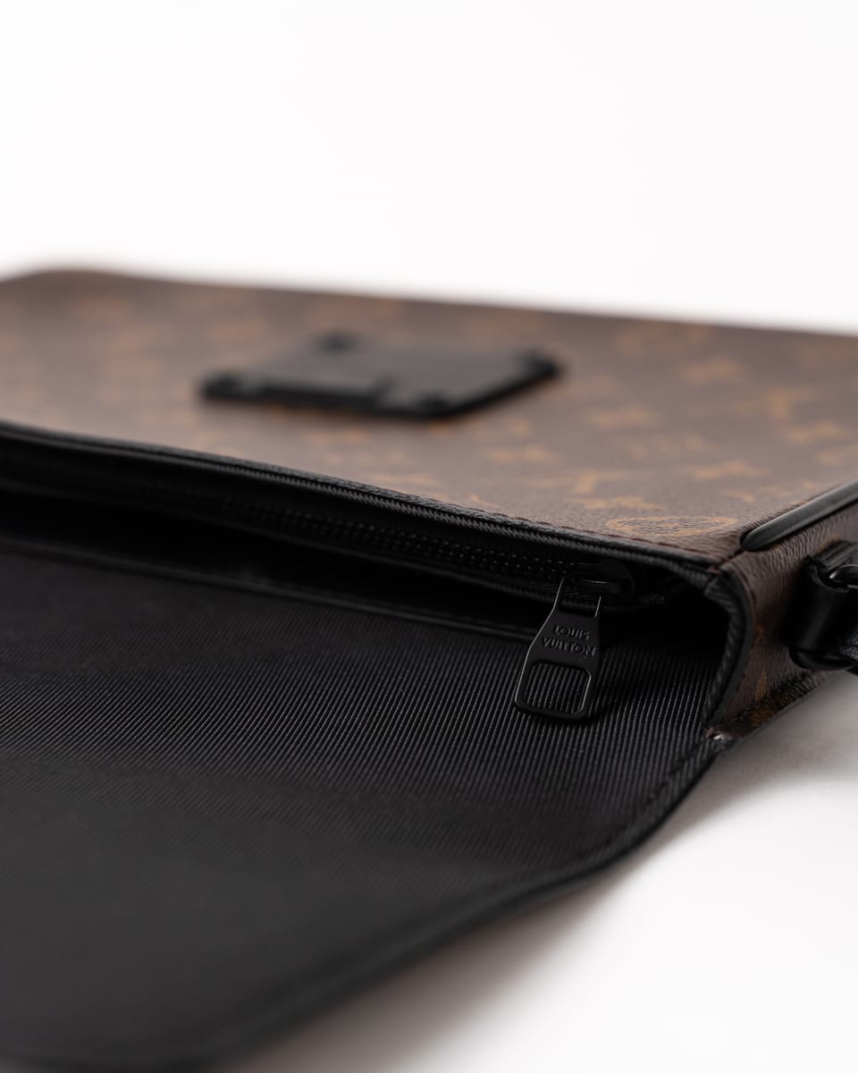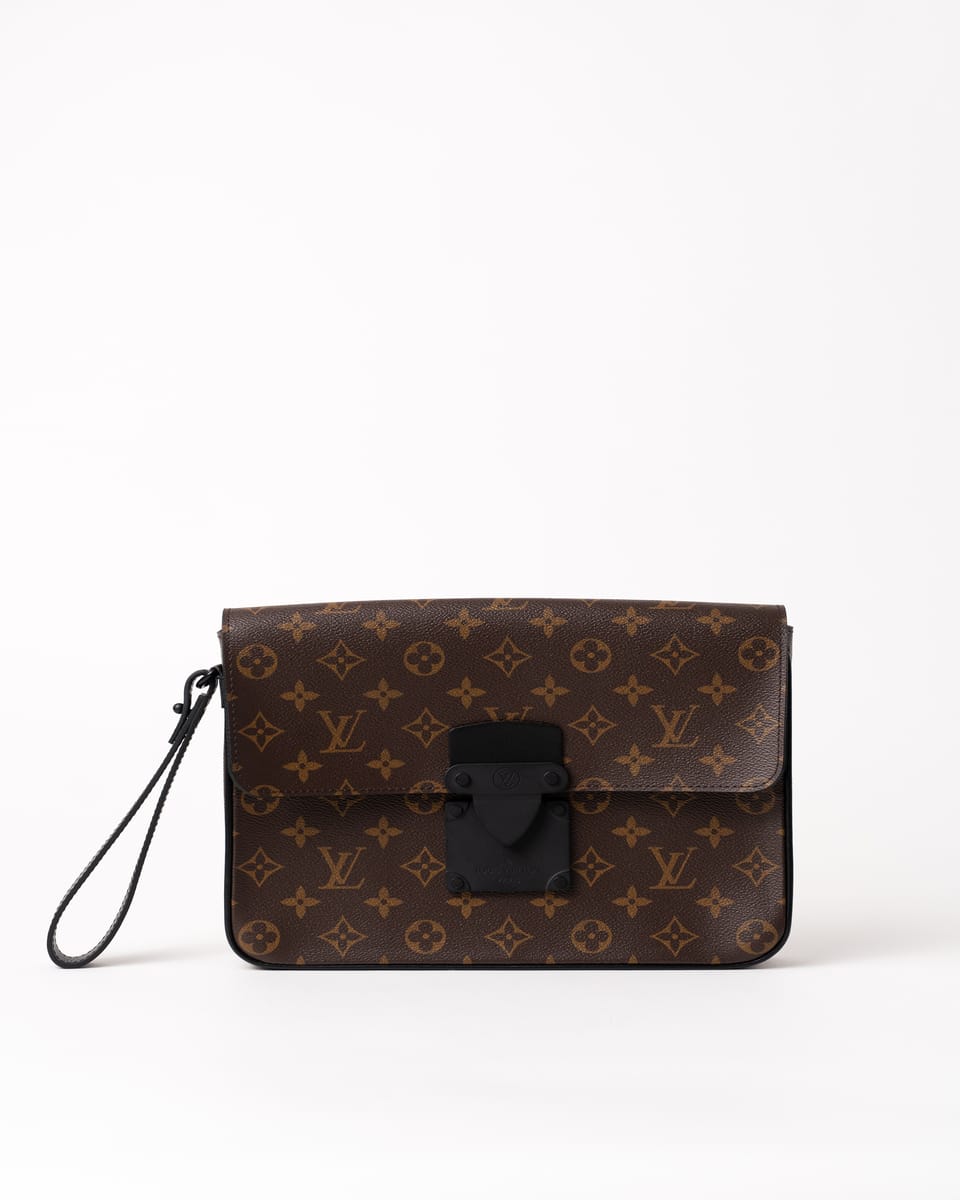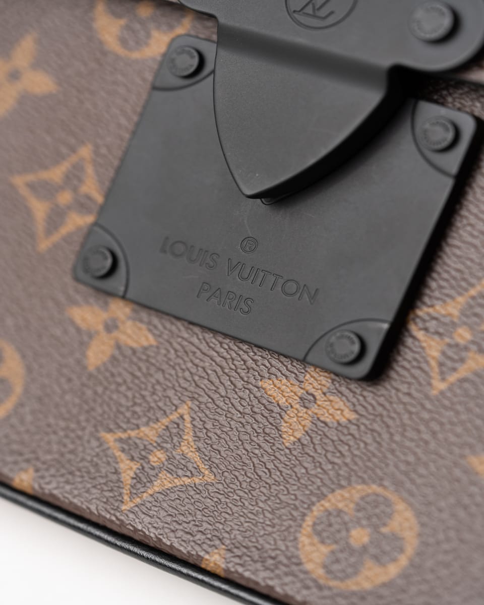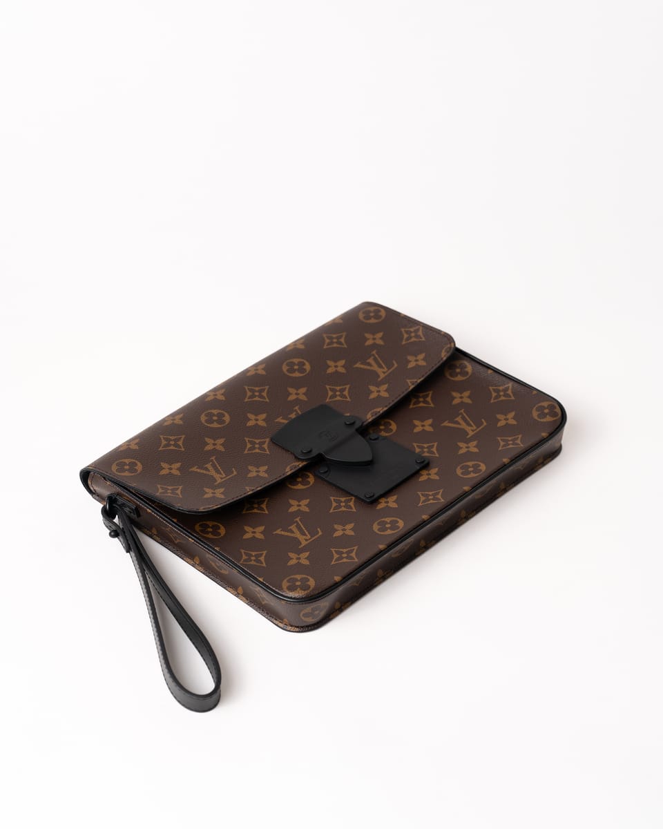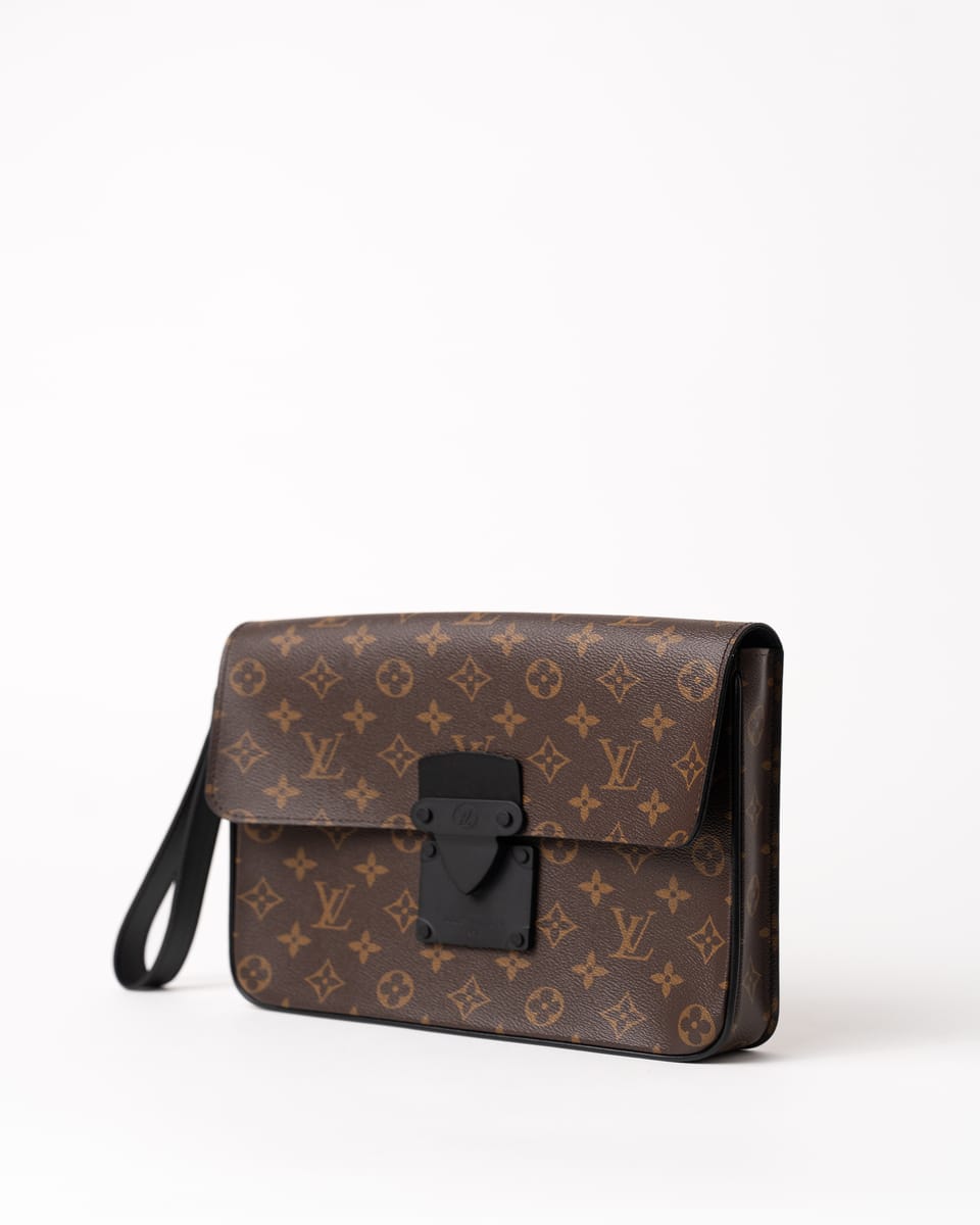 Realizat din pânză Monogram Macassar maro cu aspect placat, cu accente din piele Epi și feronerie neagră mată, prezintă închidere magnetică S Lock inspirată din cataramele trunk-urilor istorice ale lui Georges Vuitton din 1886. Dimensiunile sunt 27 x 21 x 3.5 cm, cu compartiment principal spațios, buzunar cu fermoar interior, buzunar plat cu 6 sloturi pentru carduri și brățară detașabilă.