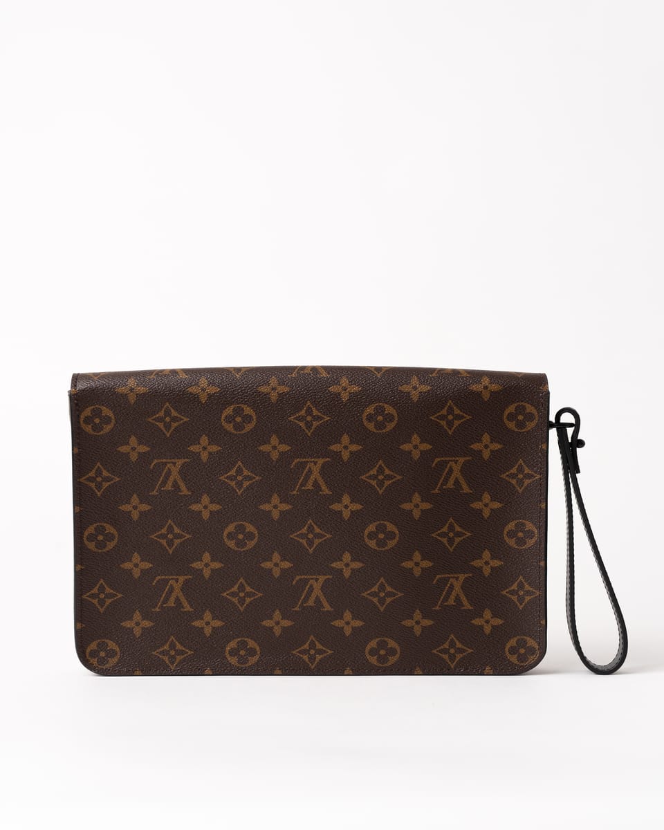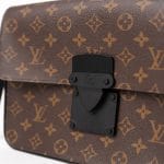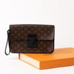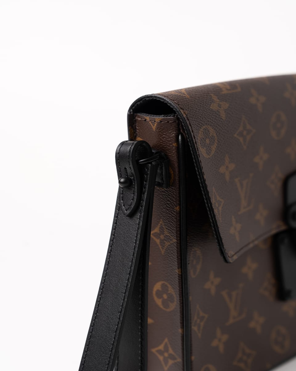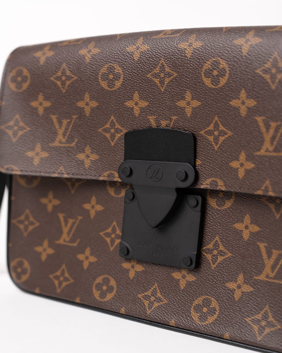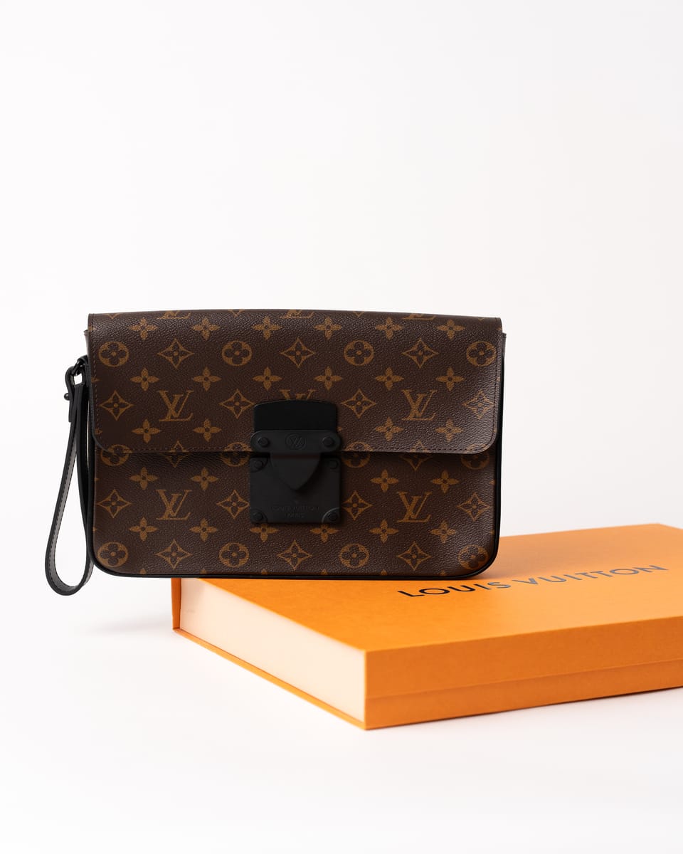 Realizat din pânză Monogram Macassar maro cu aspect placat, cu accente din piele Epi și feronerie neagră mată, prezintă închidere magnetică S Lock inspirată din cataramele trunk-urilor istorice ale lui Georges Vuitton din 1886. Dimensiunile sunt 27 x 21 x 3.5 cm, cu compartiment principal spațios, buzunar cu fermoar interior, buzunar plat cu 6 sloturi pentru carduri și brățară detașabilă.