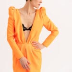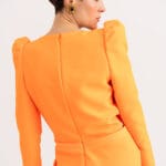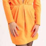 Orange deep V-neck mini dress from Saint Laurent featuring plunging v-neck, long sleeves, inverted pleat detail, back zip fastening and ruched shoulders.
