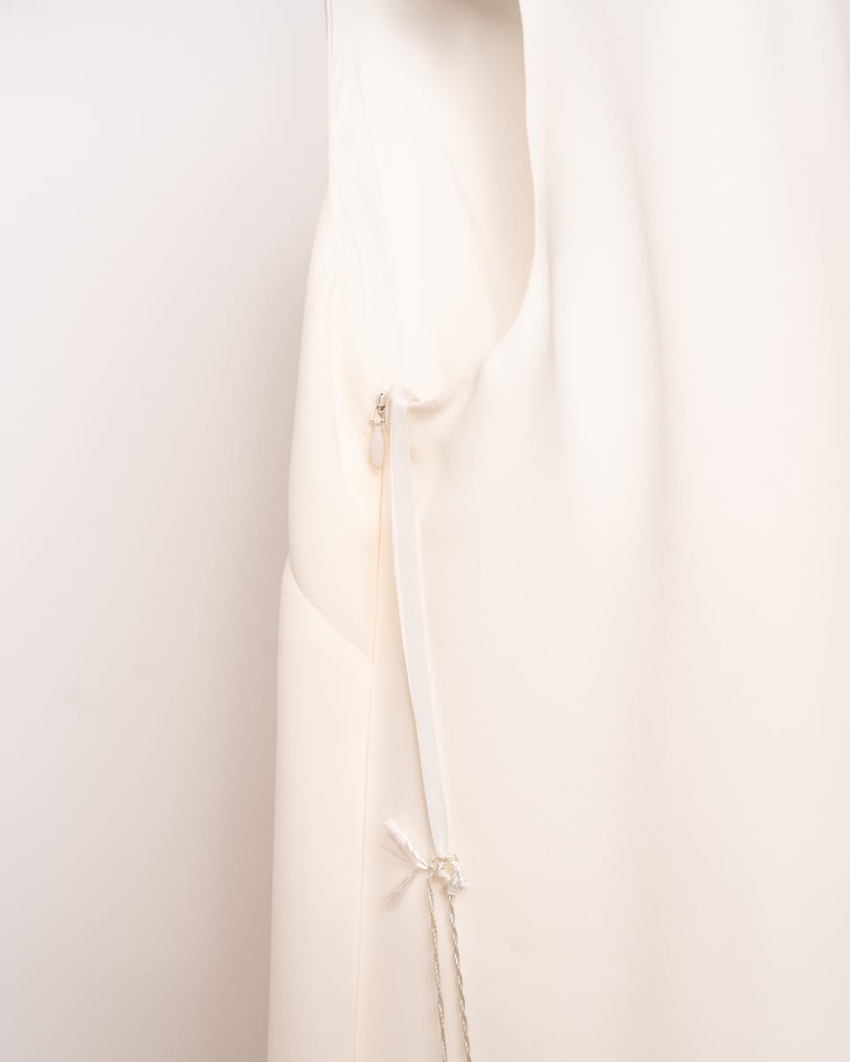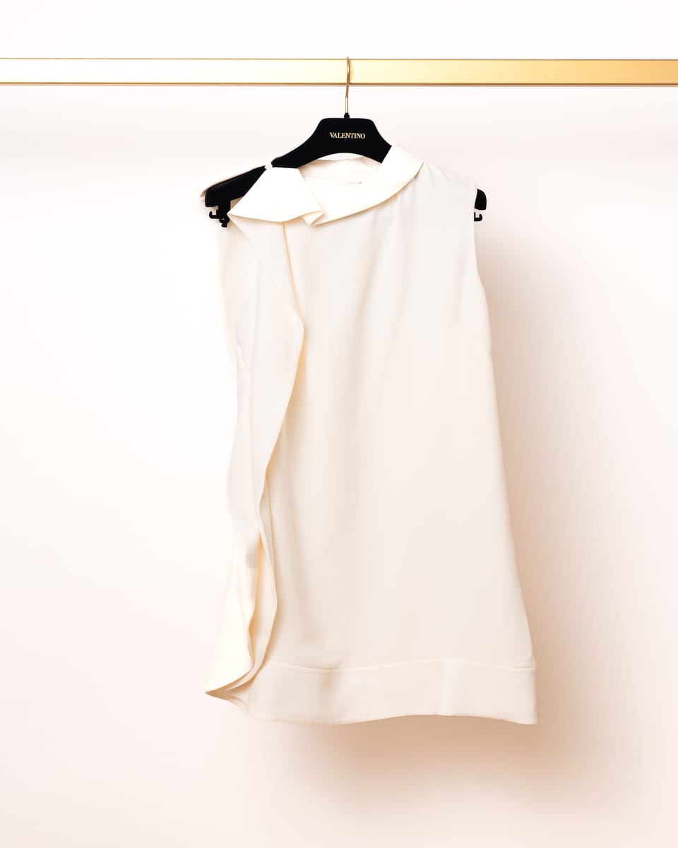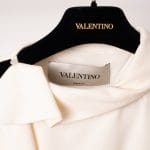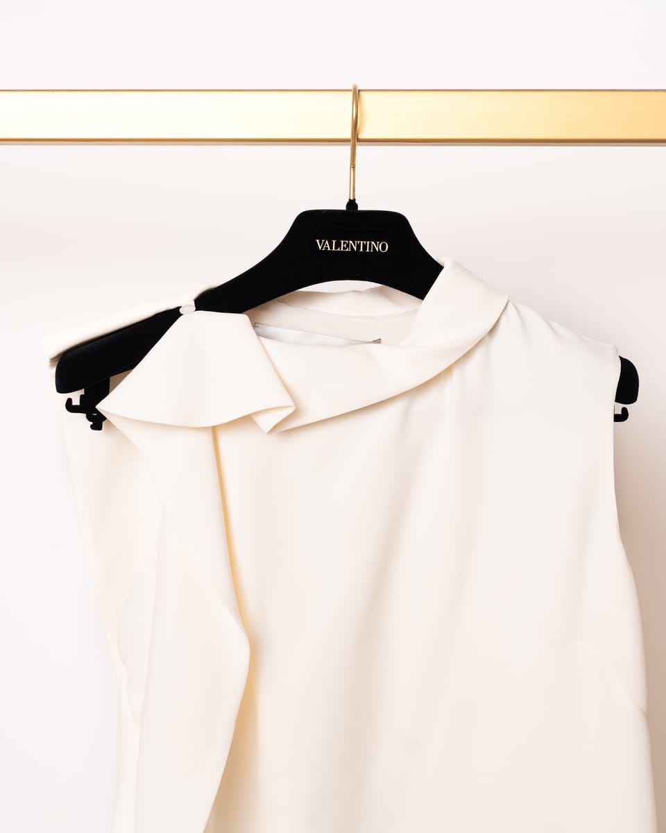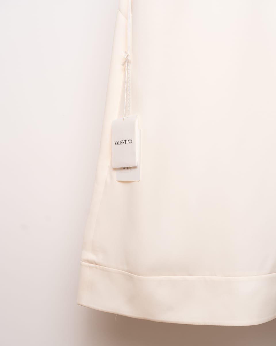 Adaugă o piesă de o eleganță absolută garderobei tale cu această rochie mini semnată Valentino. O demonstrație de minimalism sofisticat, această rochie transformă simplitatea culorii fildeșului într-o declarație de stil prin drapajele sale inovatoare și liniile curate, specifice esteticii moderne a casei italiene.