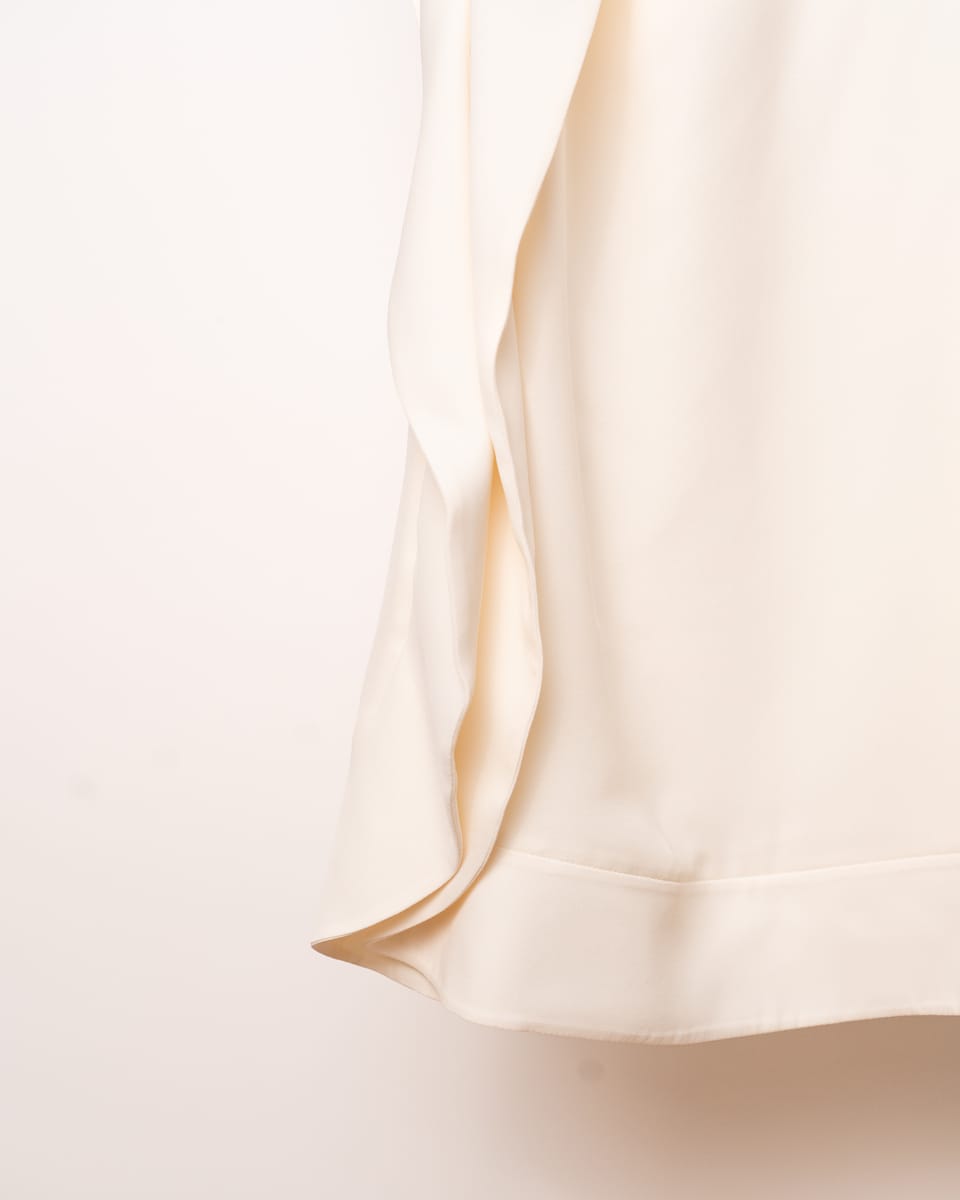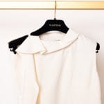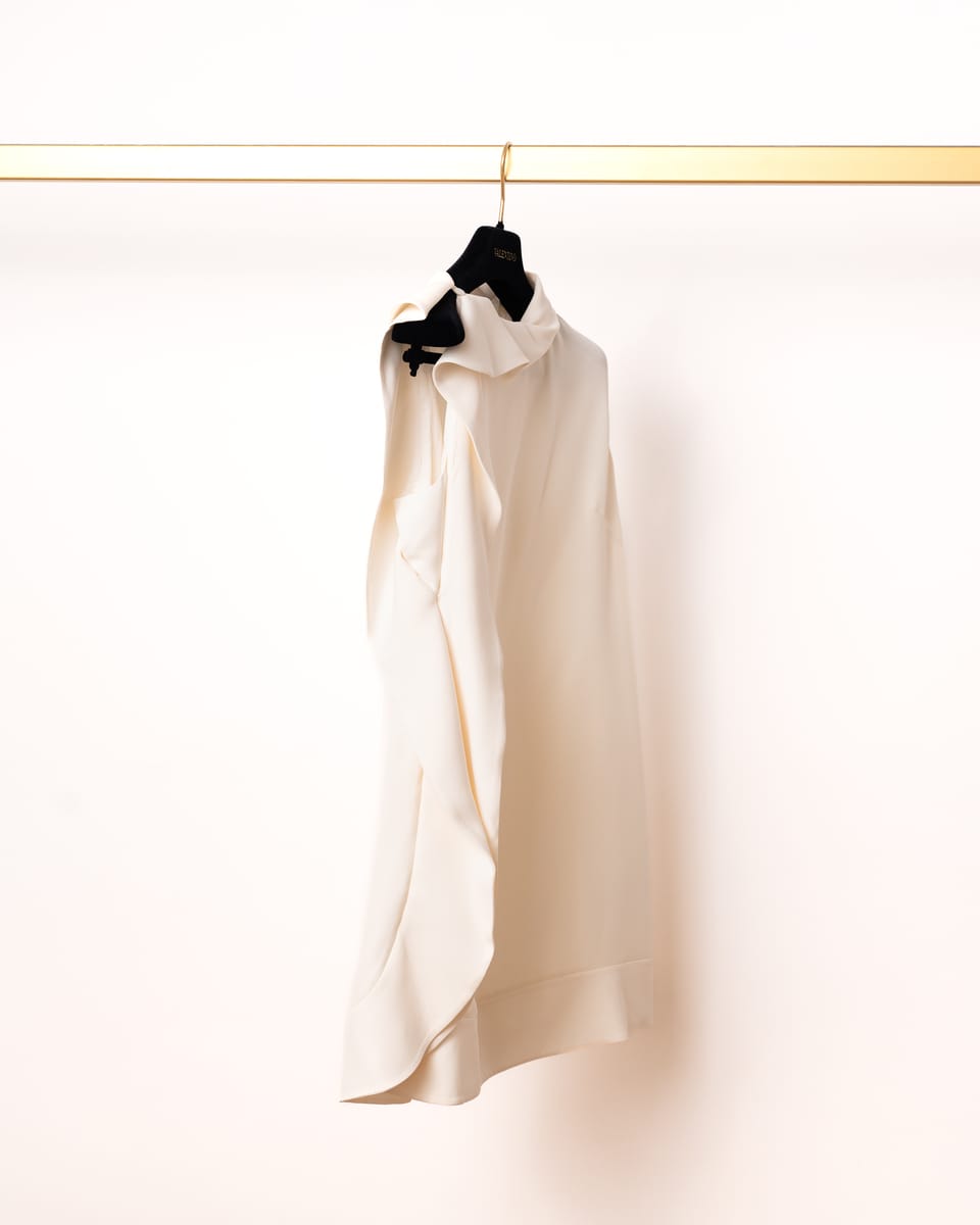 Guler „Folded”: Decolteul este subliniat de un guler deconstruit, pliat, care oferă un aspect arhitectural și protejează linia gâtului cu un rafinament discret.