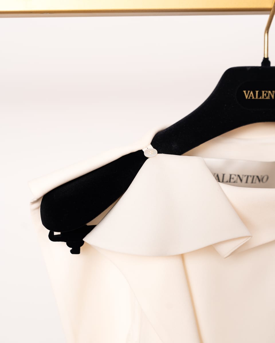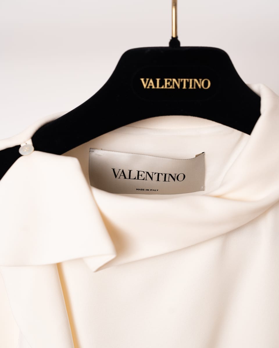 Material Luxos: Confecționată dintr-un amestec premium de mătase și lână (faimosul material crepe couture al casei Valentino), care oferă o structură impecabilă și o textură fină, mată.