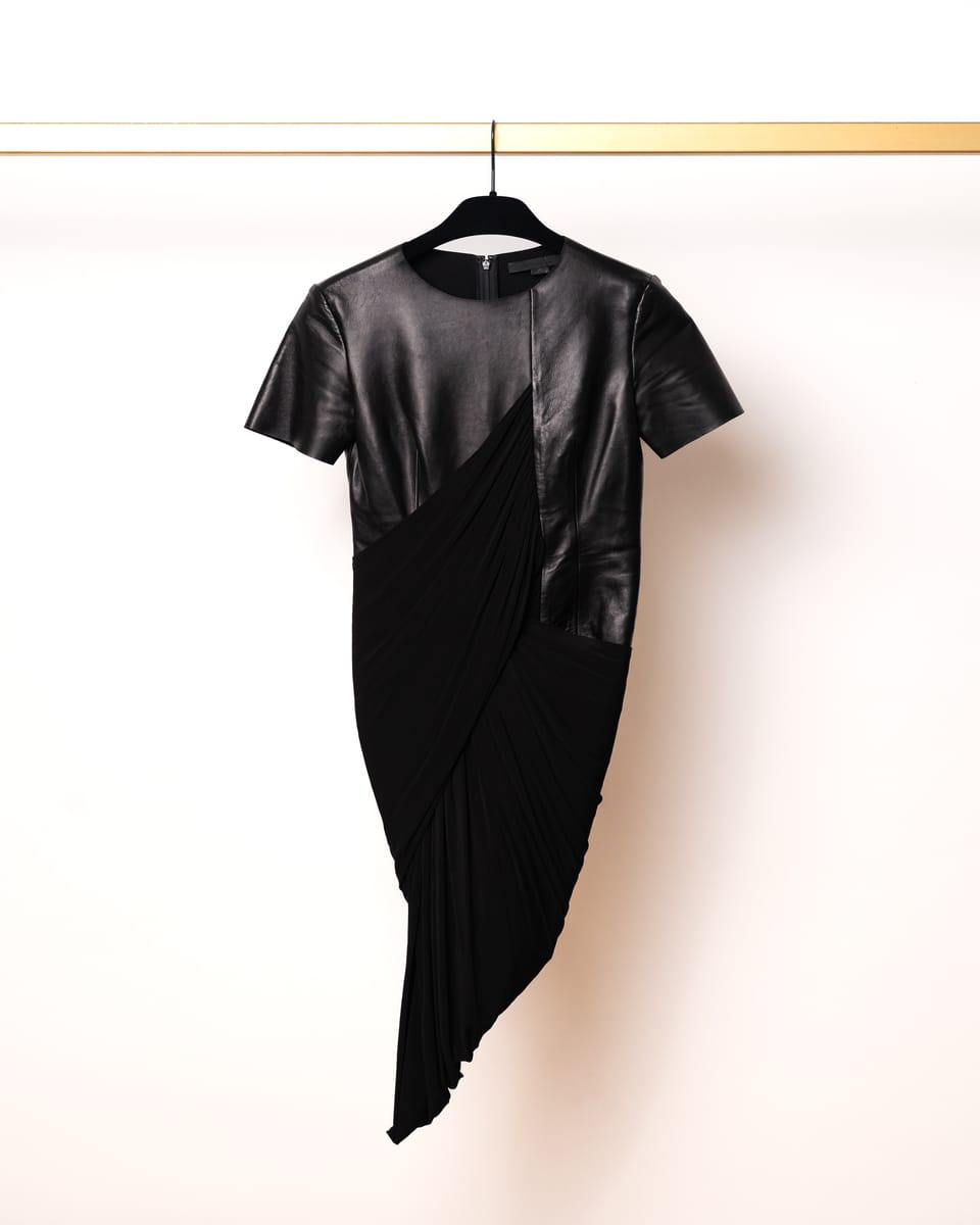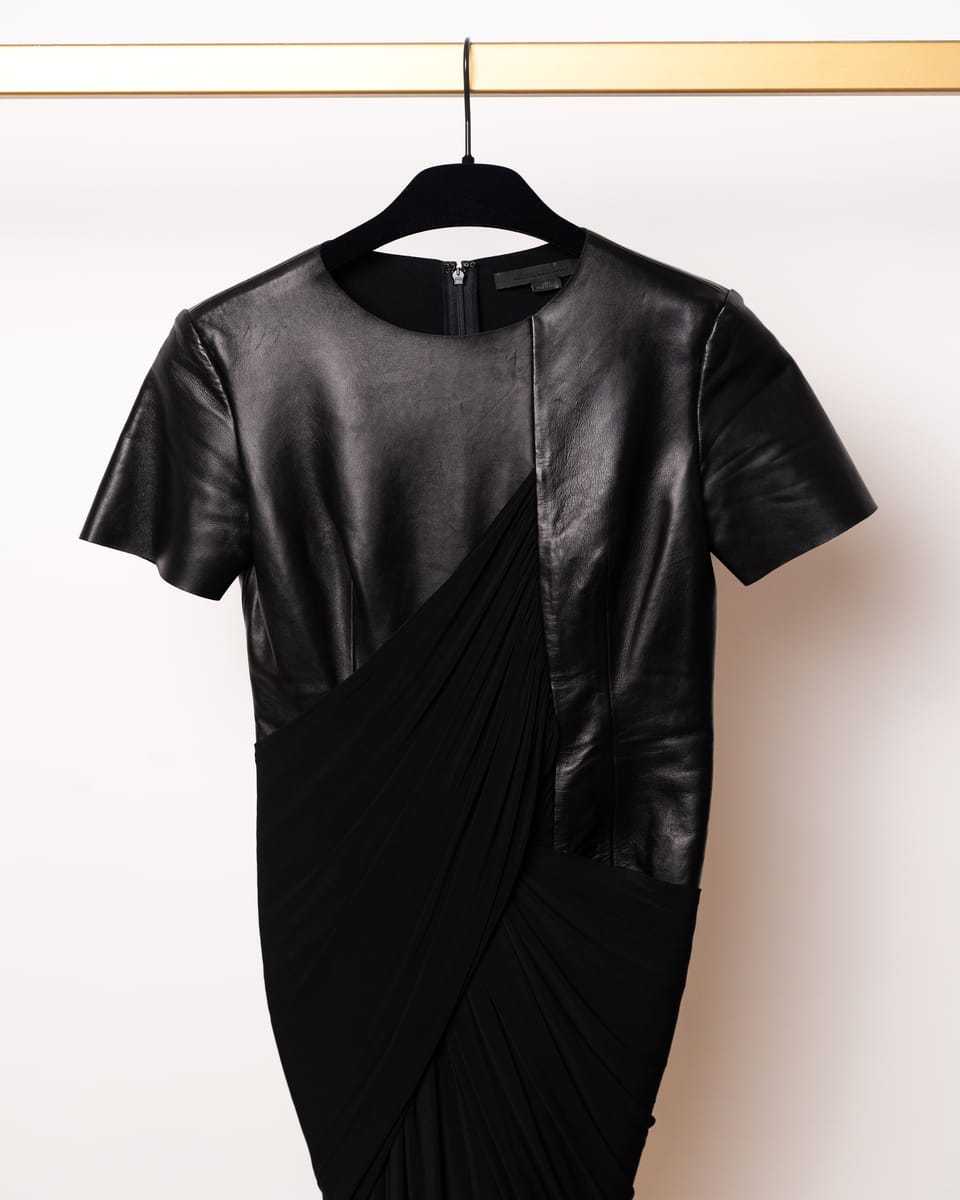 Această rochie semnată Alexander Wang este o piesă minimalistă care explorează estetica „model-off-duty”, îmbinând senzualitatea subtilă cu o croială arhitecturală. Designul se concentrează pe jocul de drapaje și pe fluiditatea materialului, oferind o siluetă relaxată, dar extrem de sofisticată.