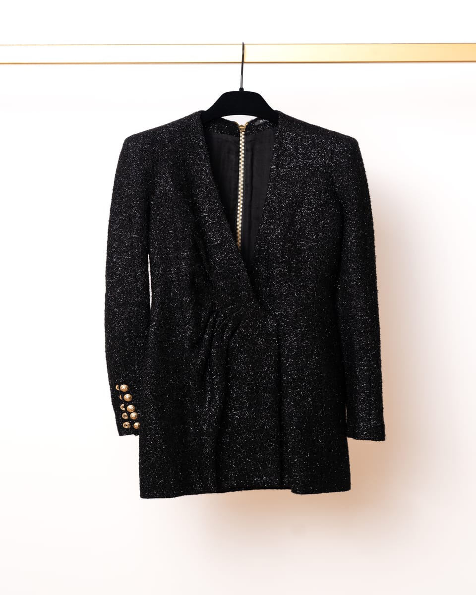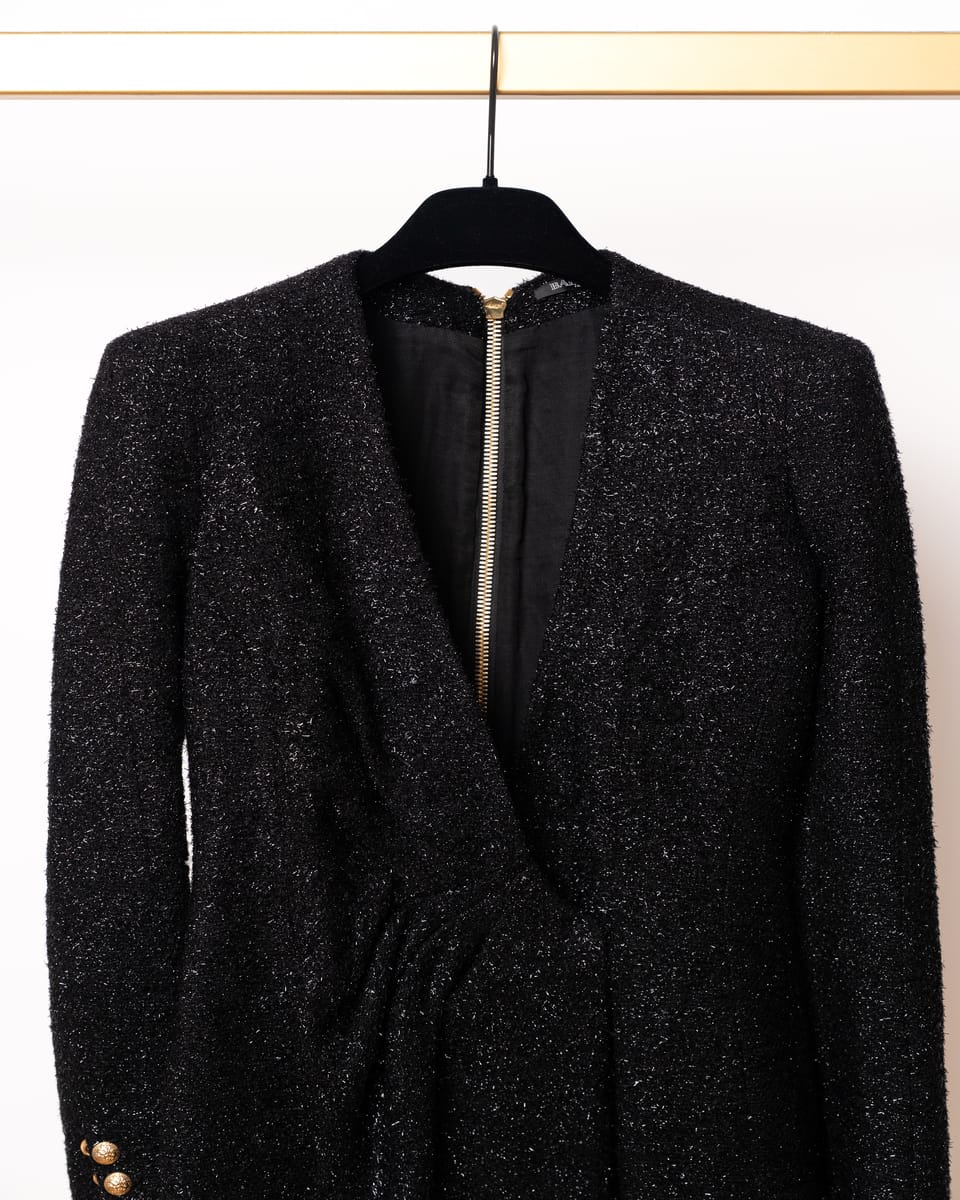 Siluetă Sculpturală: Rochia prezintă o croială mulată (fitted) care pune în evidență formele, completată de umeri structurați – o semnătură vizuală Balmain care oferă o postură autoritară și elegantă.