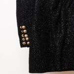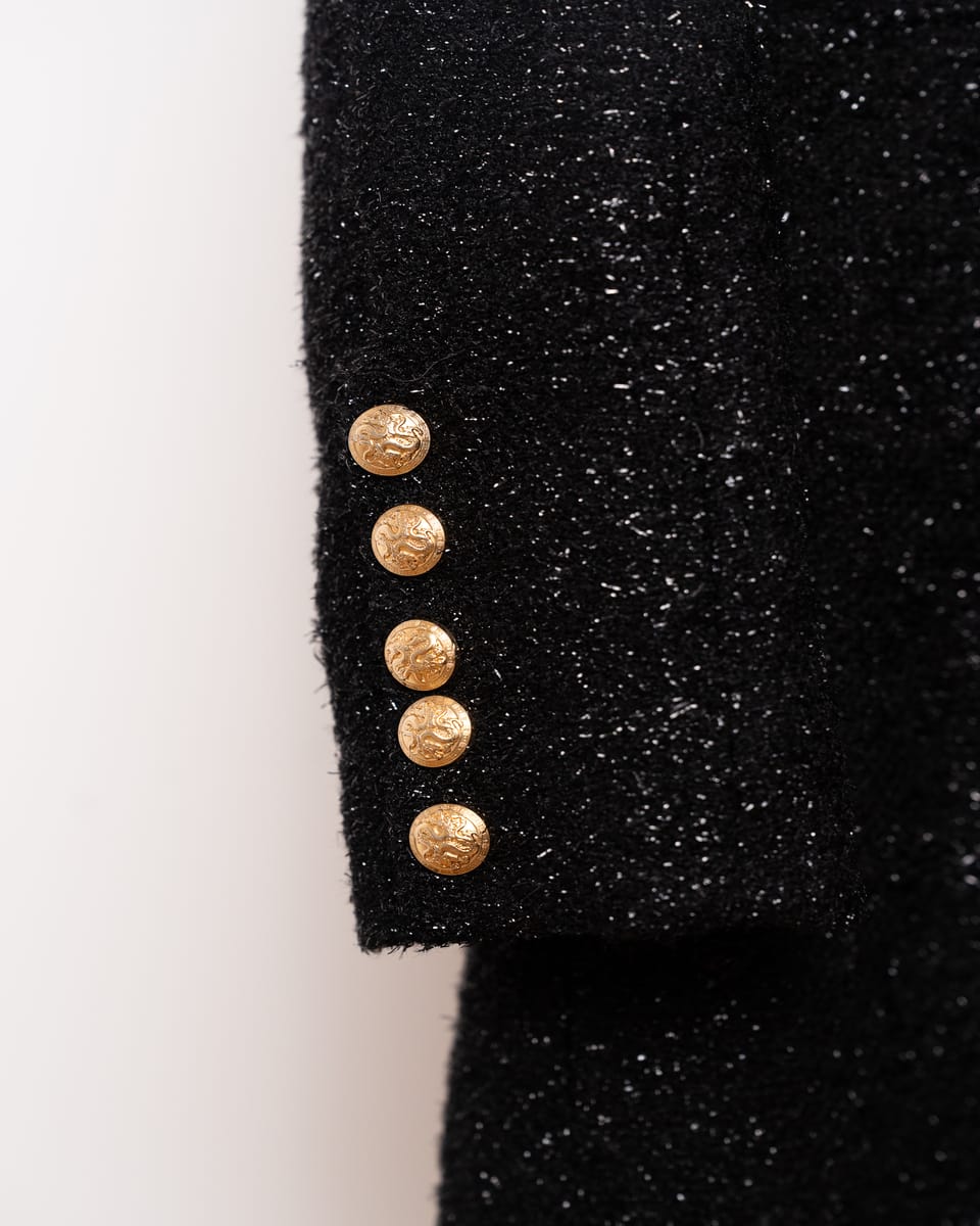 Accente Iconice: Manșetele sunt decorate cu butoni aurii reliefați, elementul de branding cel mai recunoscut al casei Balmain.