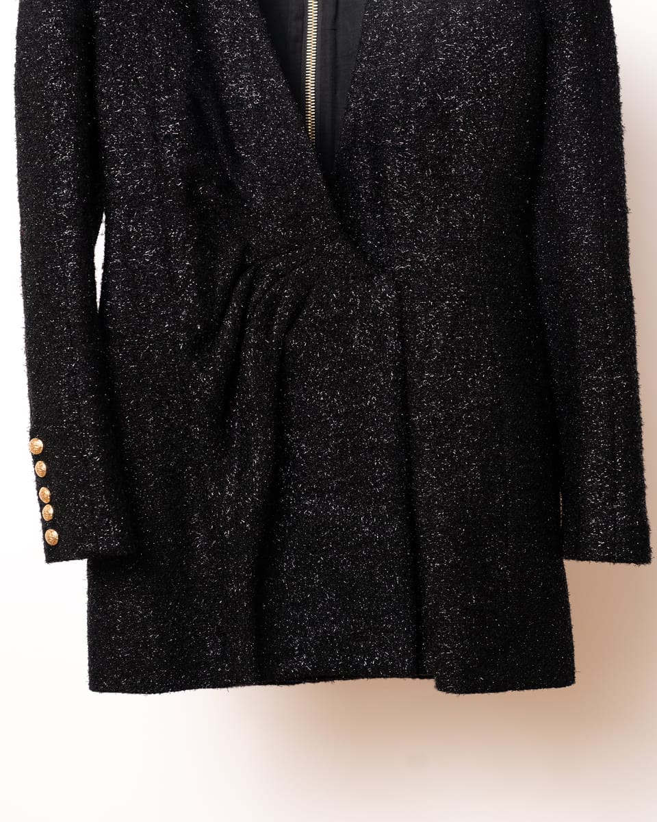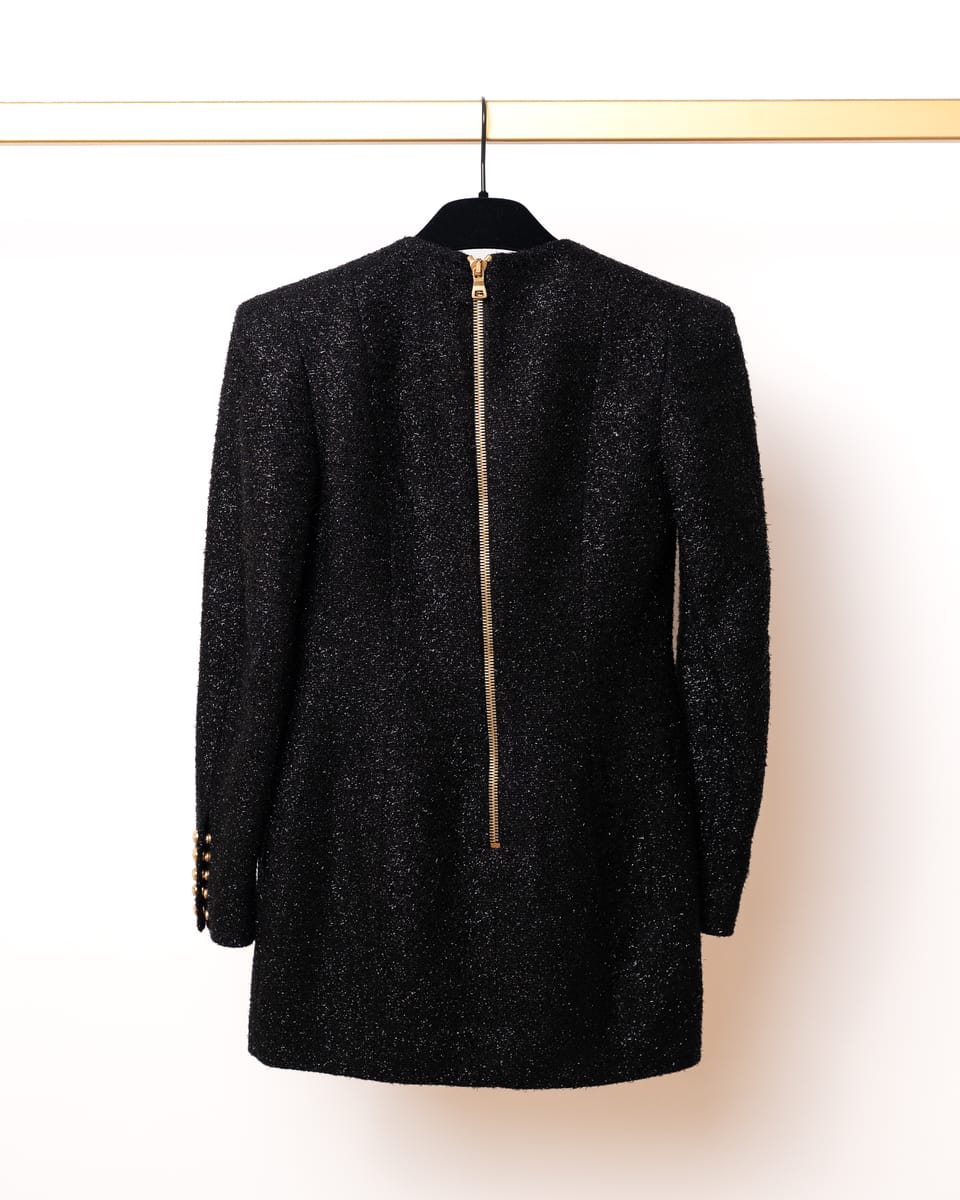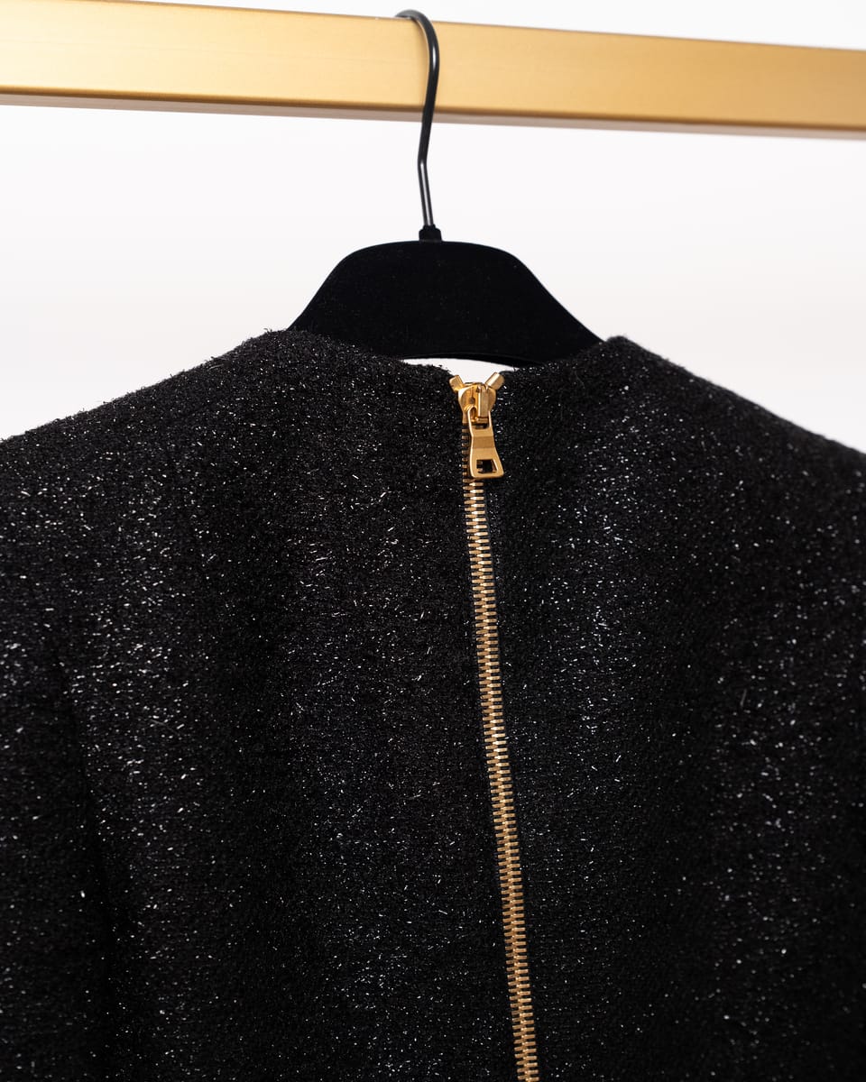 Îmbrățișează estetica inconfundabilă a casei Balmain cu această rochie mini spectaculoasă, o piesă ce îmbină croiala impecabilă cu un aer festiv. Realizată dintr-un tweed texturat cu inserții metalice care captează discret lumina, această rochie este alegerea supremă pentru evenimentele de seară unde prezența ta trebuie să fie memorabilă.
