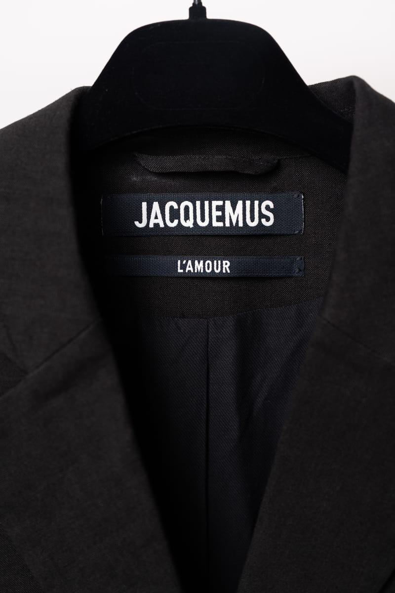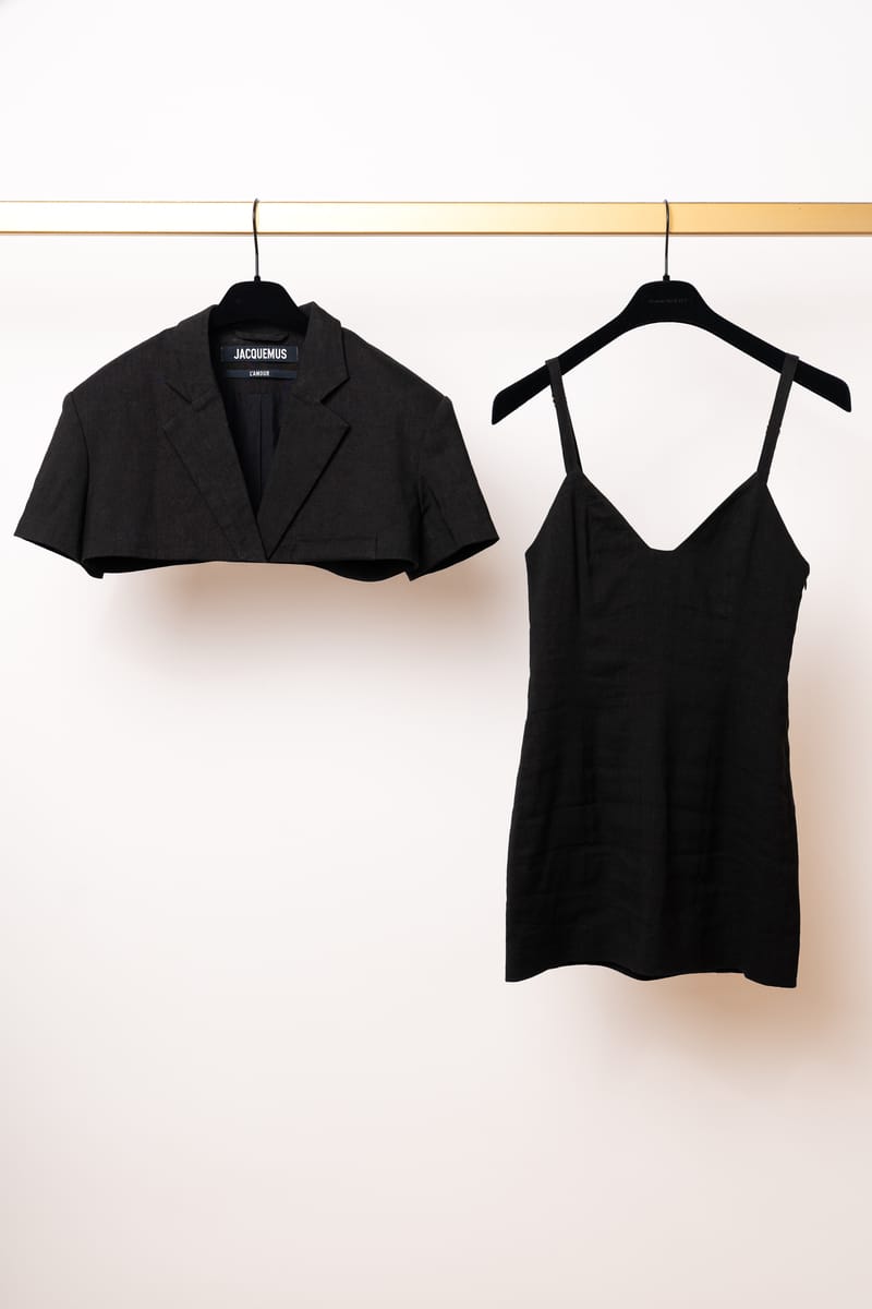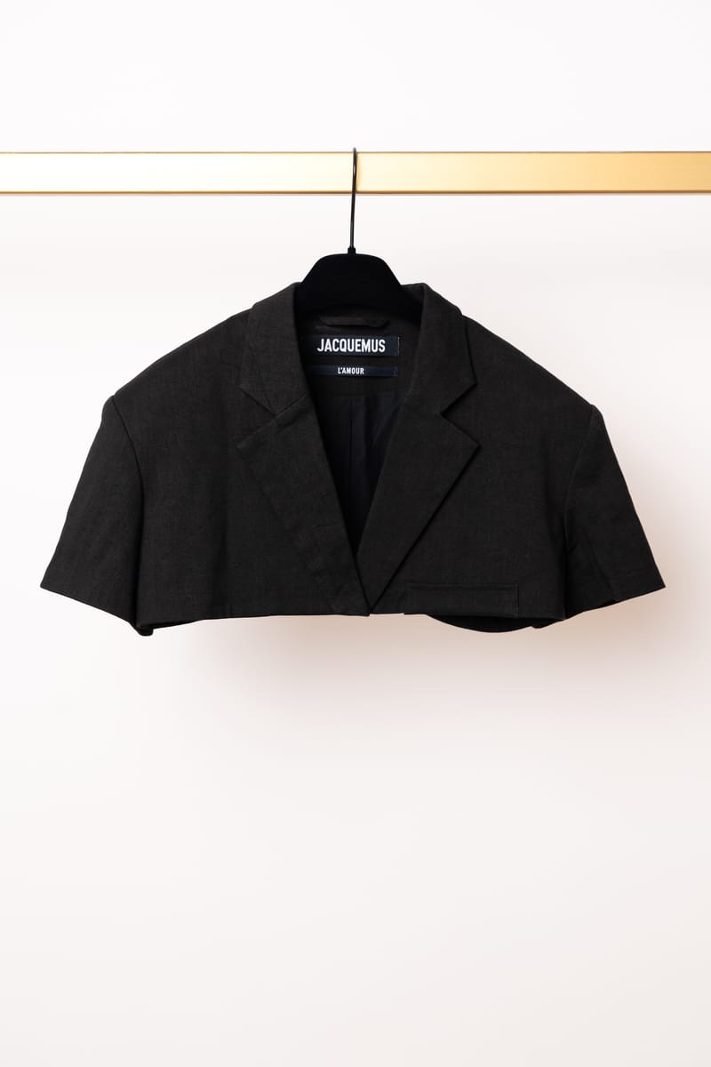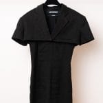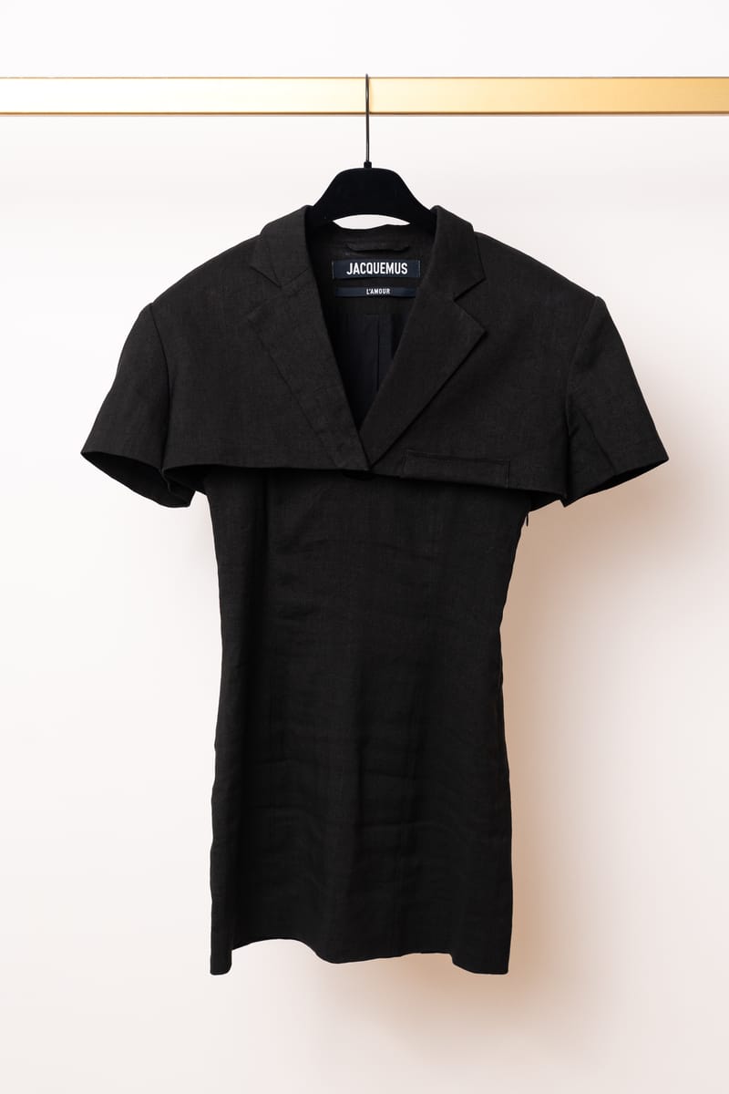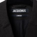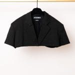 Acest ansamblu face parte din celebra colecție “L’Amour”, prezentată de Simon Porte Jacquemus într-un lan de grâu, simbolizând dragostea și simplitatea rustică reinterpretată într-o manieră minimalist-modernă. Setul este format dintr-o rochie mini stil furou și un sacou ultra-scurt, ambele realizate din fibre naturale.
