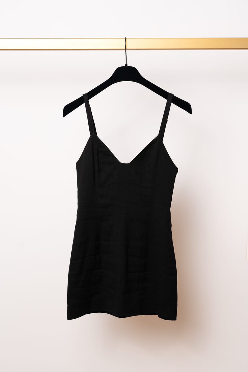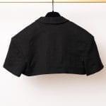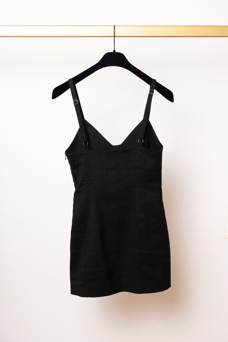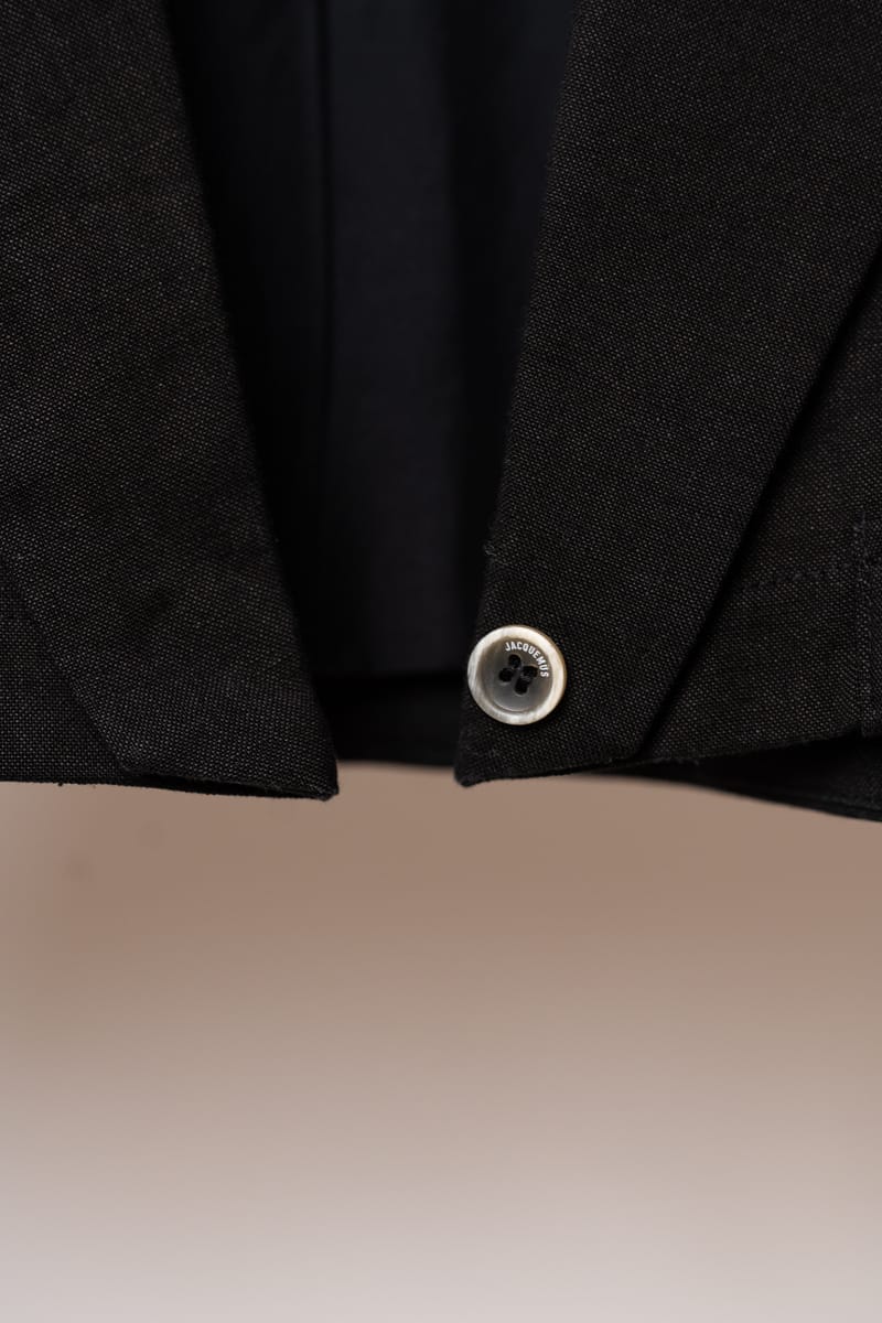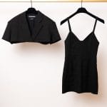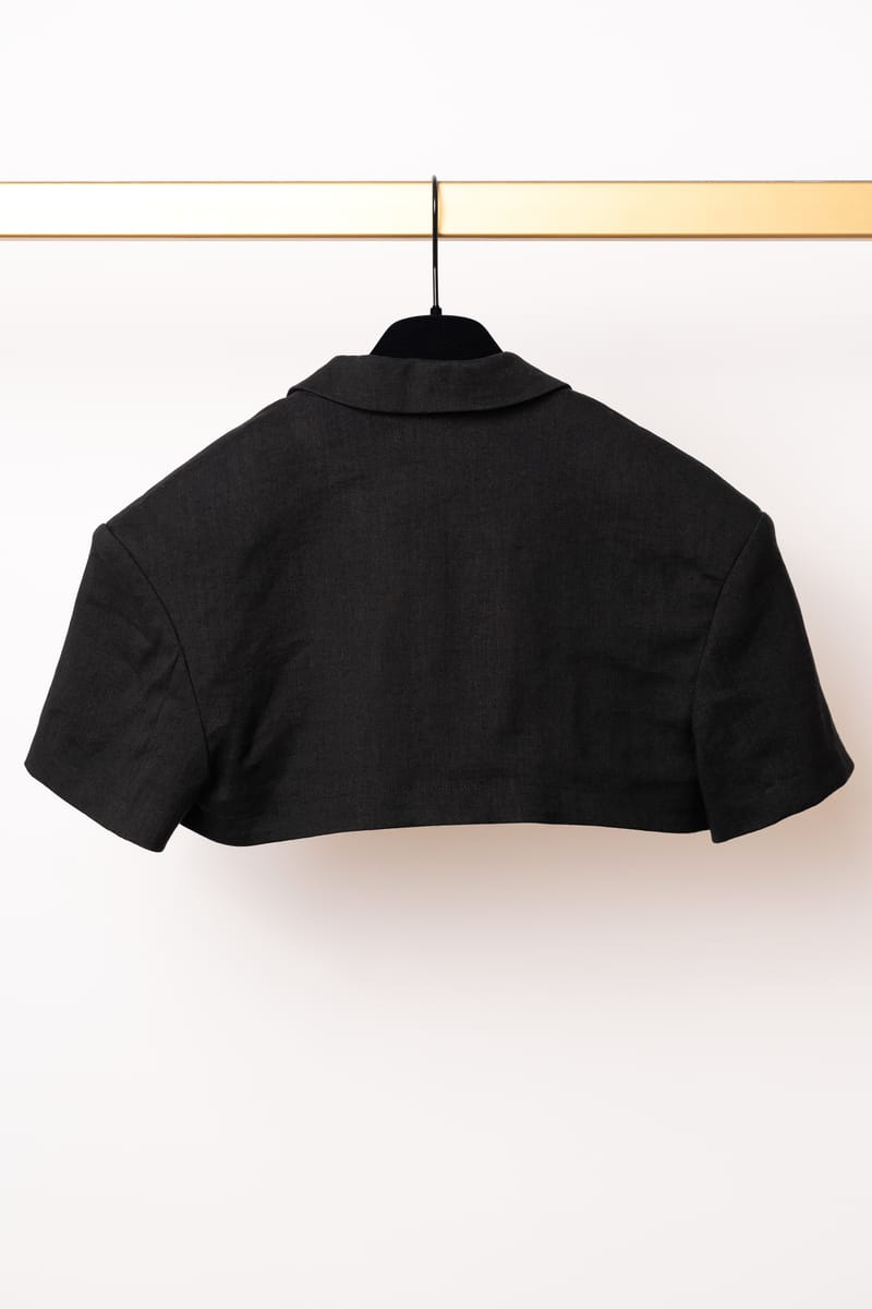 Acest ansamblu face parte din celebra colecție “L’Amour”, prezentată de Simon Porte Jacquemus într-un lan de grâu, simbolizând dragostea și simplitatea rustică reinterpretată într-o manieră minimalist-modernă. Setul este format dintr-o rochie mini stil furou și un sacou ultra-scurt, ambele realizate din fibre naturale.