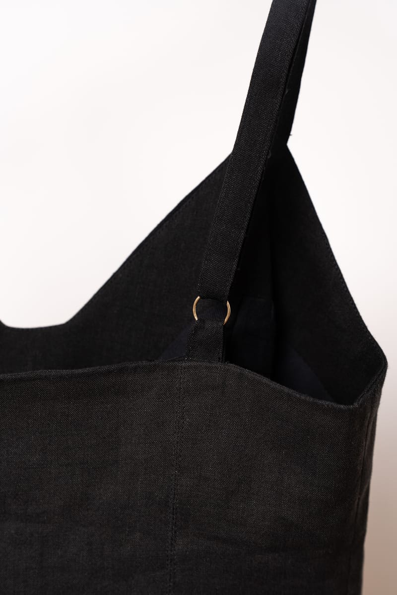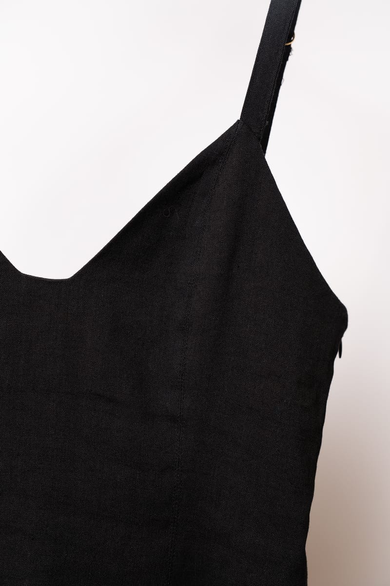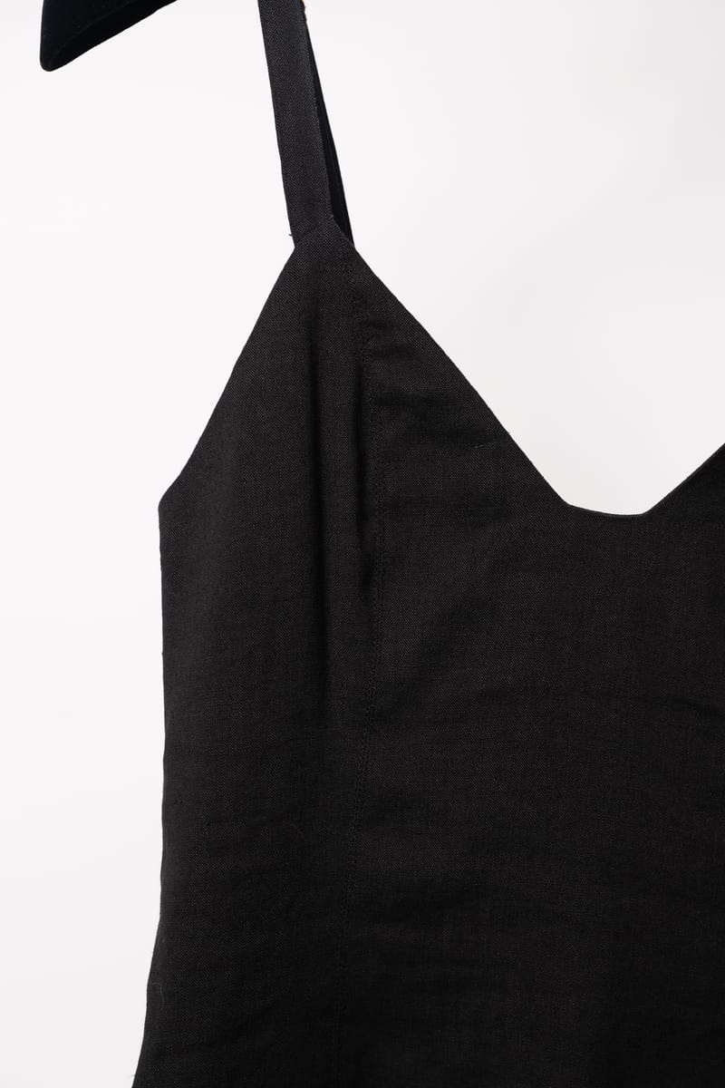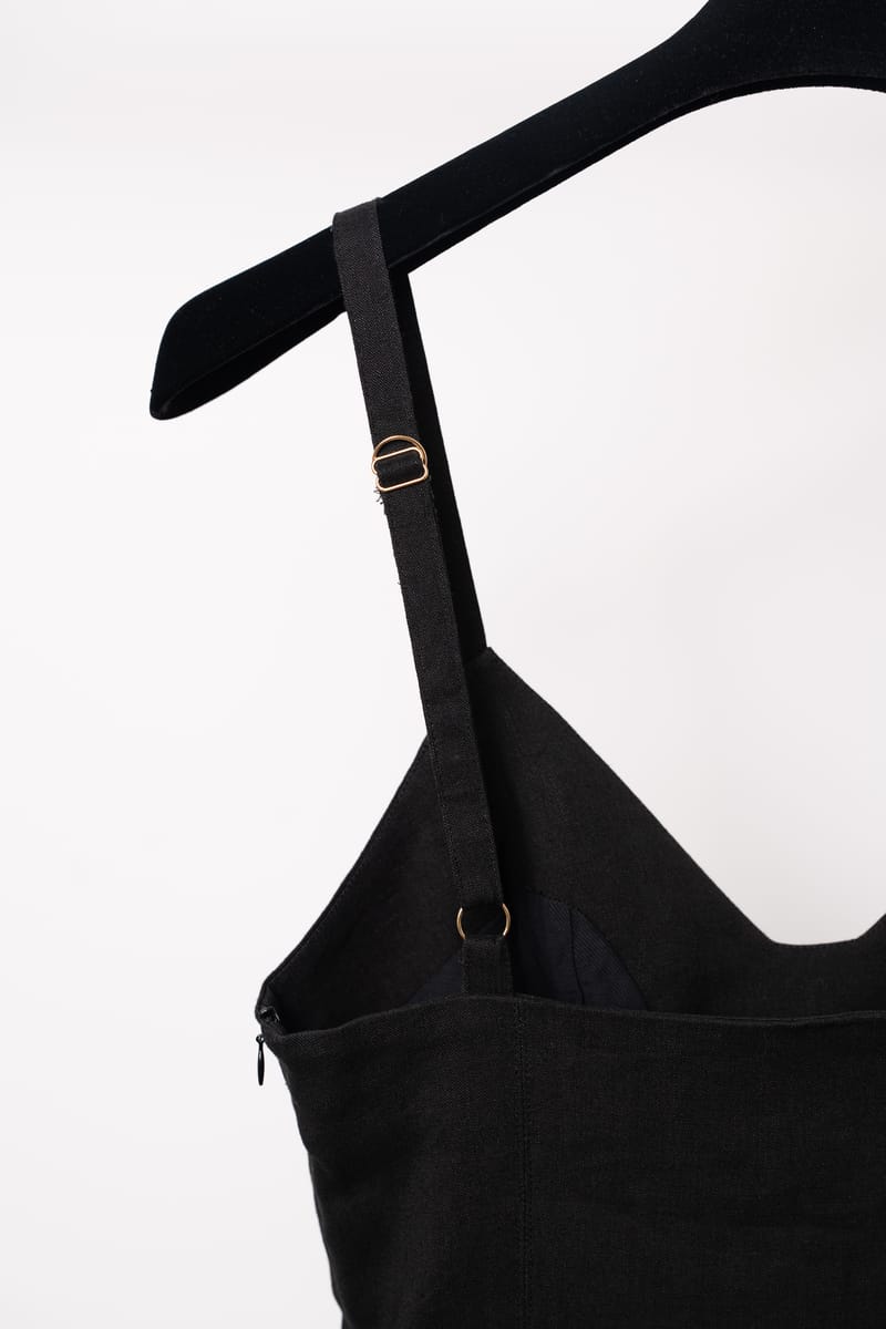 Textură: Materialul prezintă cusături orizontale subtile care adaugă structură și un detaliu vizual rafinat rochiei negre.