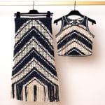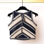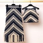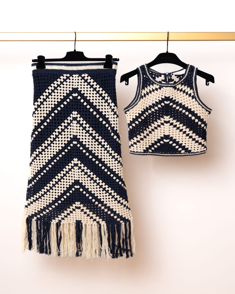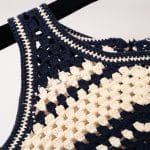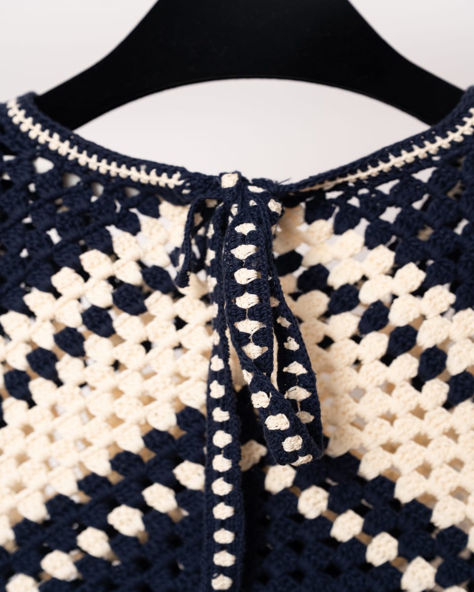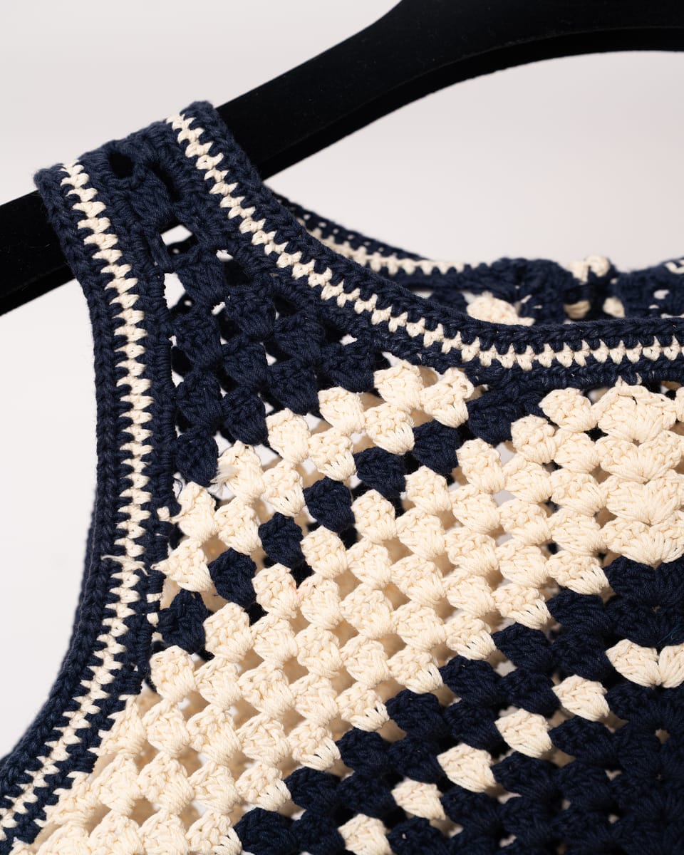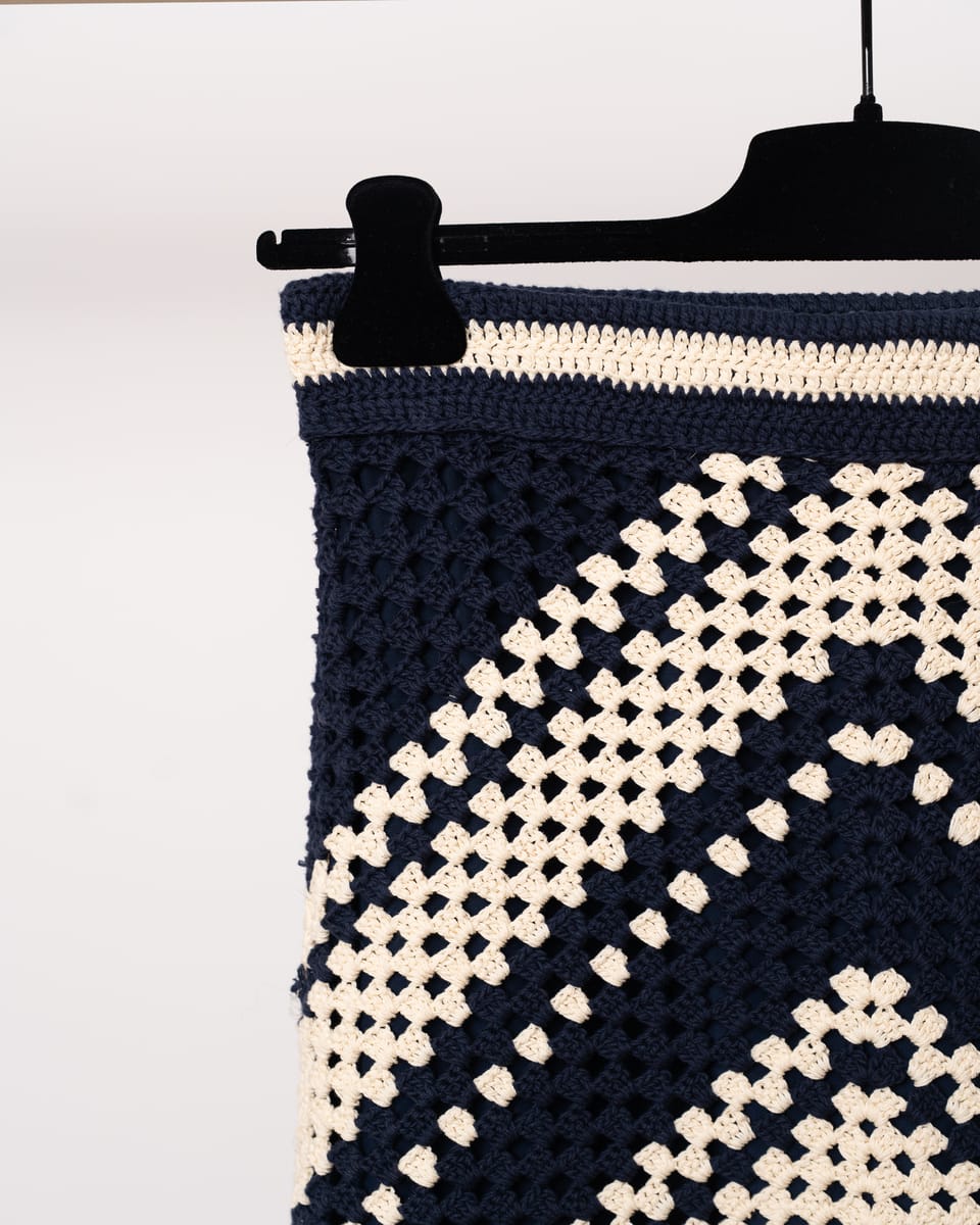 Contrast de Texturi: Deoarece setul este foarte bogat vizual, evită accesoriile prea încărcate. O pereche de sandale din piele netedă, maro închis, și o geantă simplă din piele vor echilibra densitatea bumbacului croșetat.