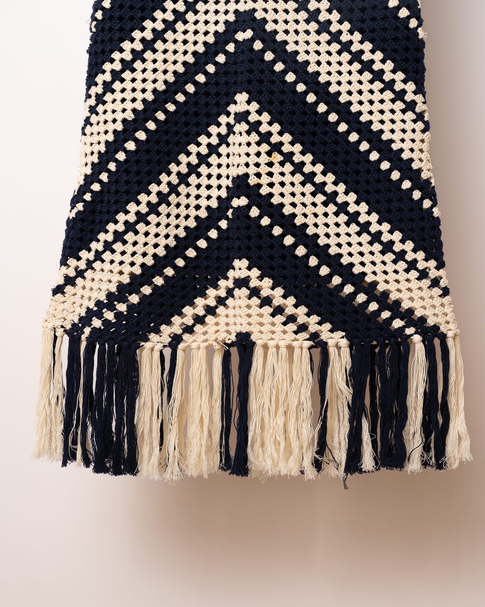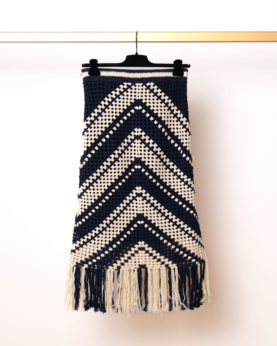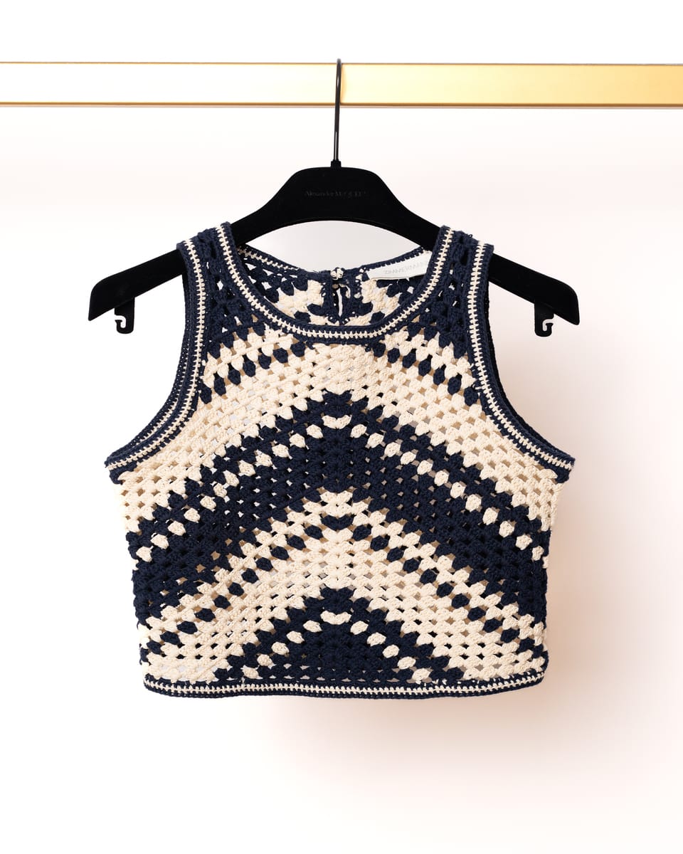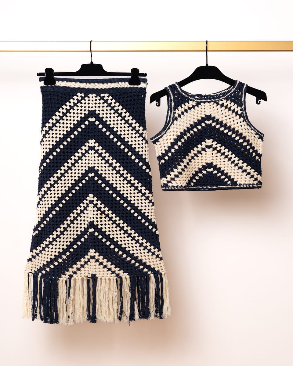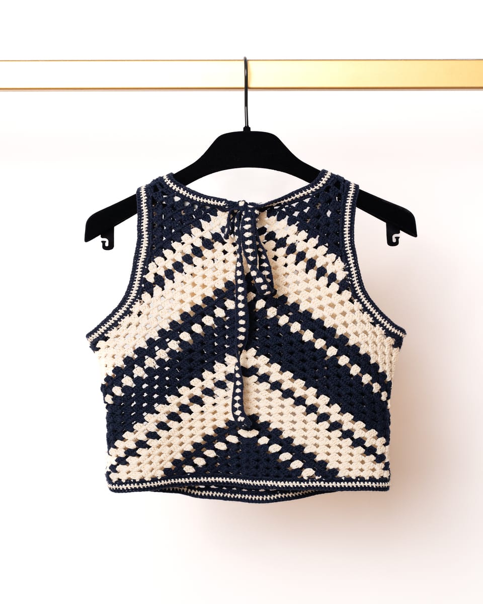 Contrast de Texturi: Deoarece setul este foarte bogat vizual, evită accesoriile prea încărcate. O pereche de sandale din piele netedă, maro închis, și o geantă simplă din piele vor echilibra densitatea bumbacului croșetat.