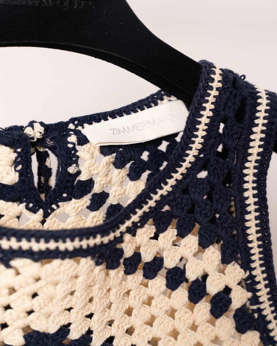 Acest ansamblu spectaculos face parte din colecțiile de resort ale casei Zimmermann, fiind realizat din bumbac premium, lucrat cu o tehnică ce imită croșetul manual. Este o piesă de colecție care îmbină măiestria artizanală cu designul modern.