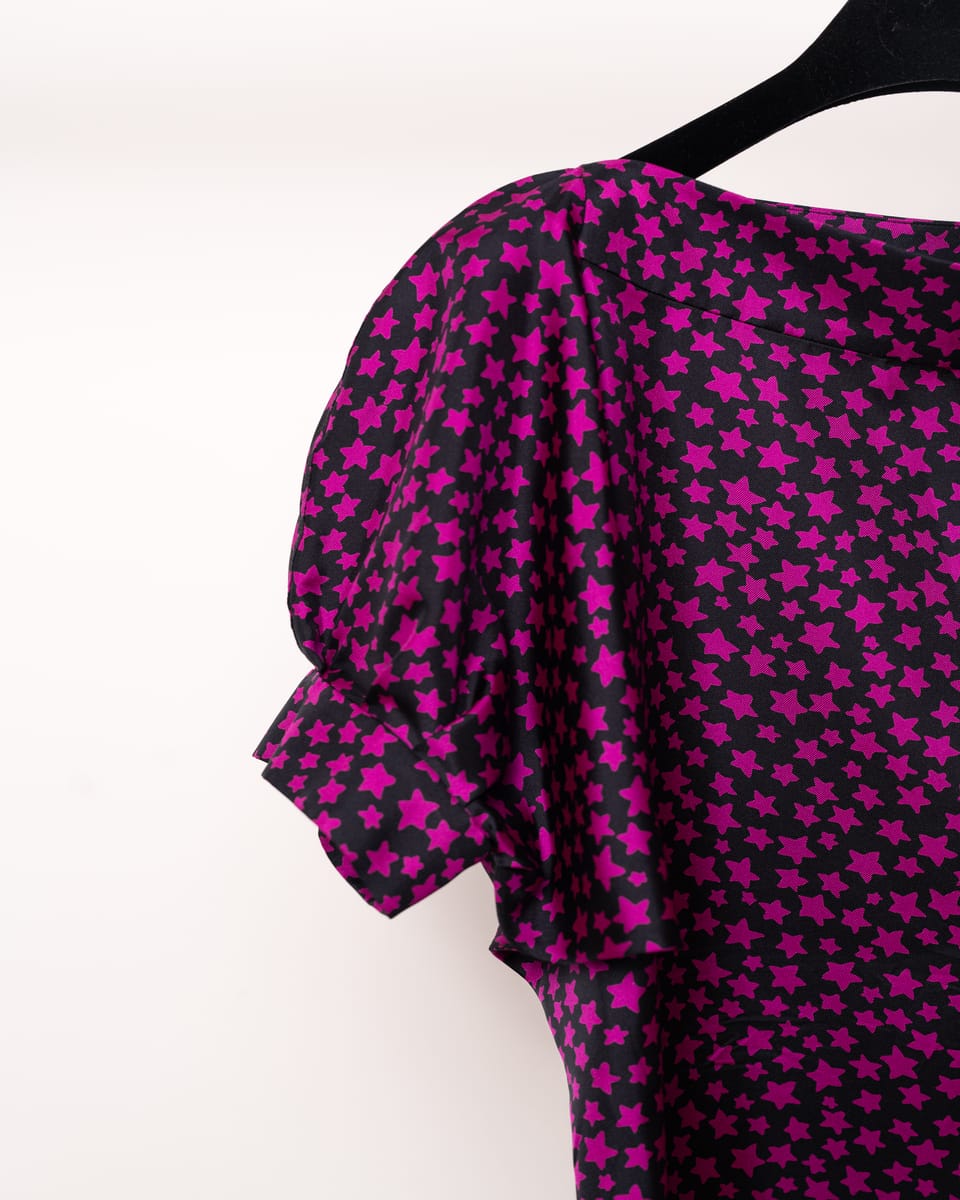 Imprimeu Iconic: Modelul prezintă celebrul motiv cu stele contrastante, o semnătură vizuală a anului 2008, care combină eleganța clasică YSL cu o energie ludică și modernă.